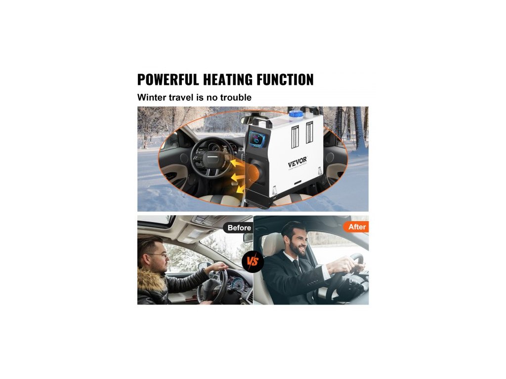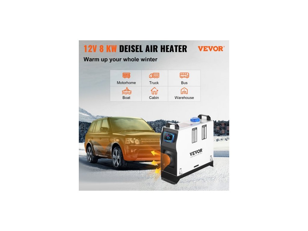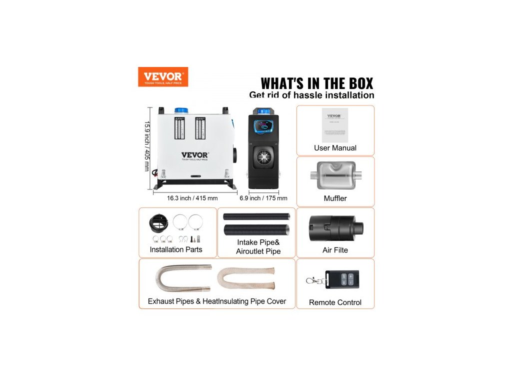 Nastavitelná teplota Rozsah: 64,4℉-104℉/18℃-40℃,Typ klimatizace: Topení,Typ paliva: Nafta,Jmenovité napětí: 12V,Spotřeba paliva: 0,1-0,24 (l/h)/0,026 - 0,063 (gal/h),Objem nádrže: 5l/1,3 gal,Úplný stupeň spalování: 100 %,Rozměry topení (D x Š x V): 13,8 x 5,9 x 16,1 palce/35 x 15 x 41 cm,Rozměry výfukového potrubí (D x Š): 60 x 2,5 cm/23,6 x 0,98 palce,Spínač: LCD,Dosah dálkového ovládání: 98 stop/30 m,Výkon topení: 8 kW,Rozměry vstupního potrubí (D x Š): 45 x 2,5 cm/17,7 x 0,98 palce, rozměry výstupní trubky (D x Š): 70 x 7,6 cm / 27,6 x 2,99 palce