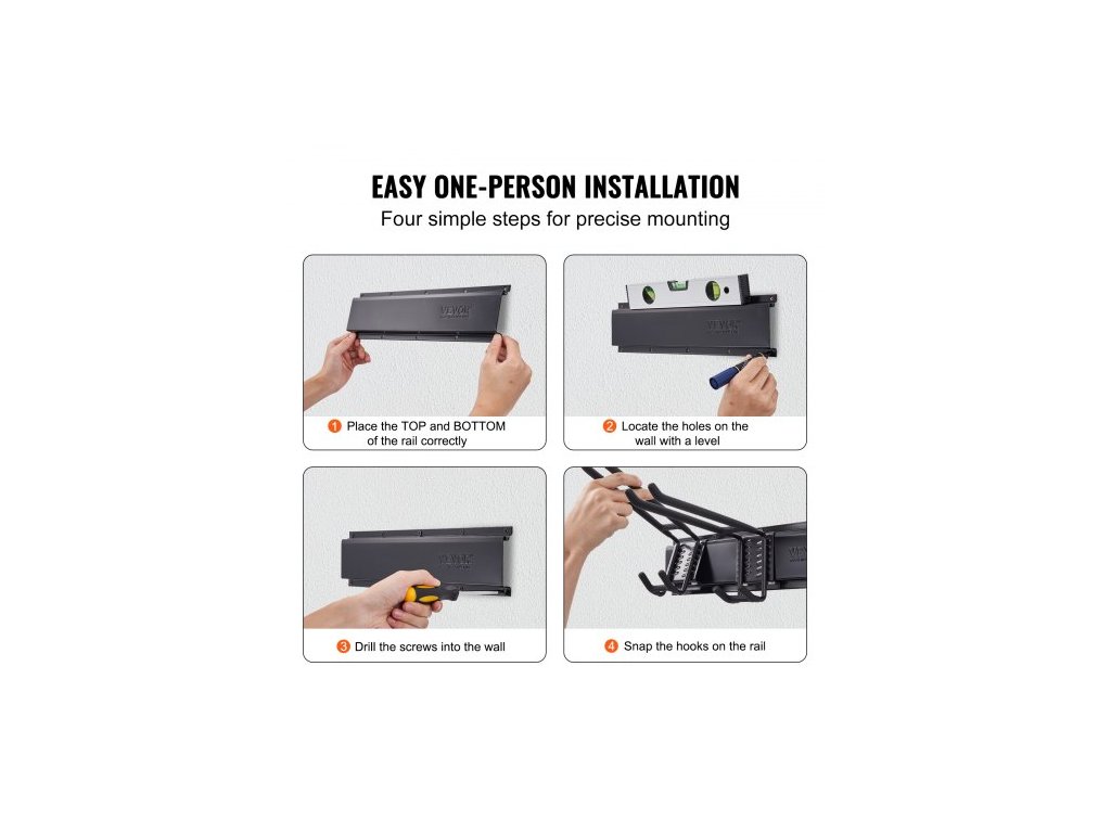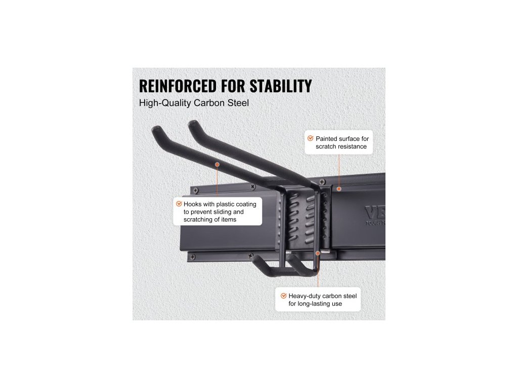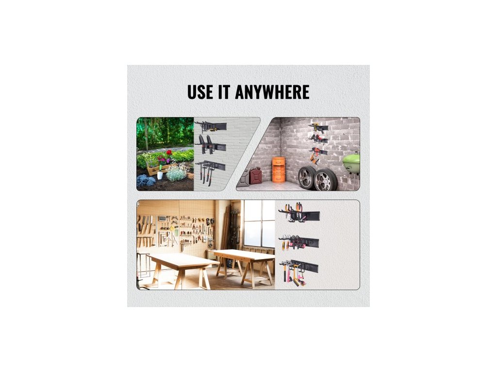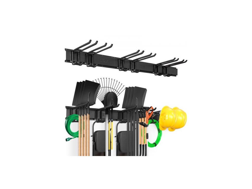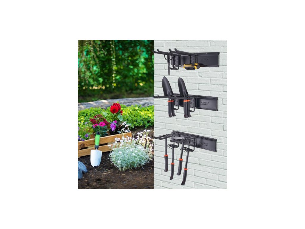 Organizér na nářadí do garáže, maximální nosnost 362,9 kg, nástěnný úložný stojan na zahradní nářadí, odolný, se 6 nastavitelnými háky a 3 kolejnicemi, pro zahradní nářadí, lopaty, vyžínače a hadiceRobustní a stylový