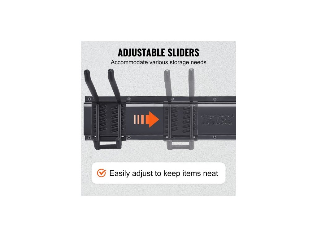 Organizér na nářadí do garáže, maximální nosnost 362,9 kg, nástěnný zahradní úložný stojan, odolný proti opotřebení, se 6 nastavitelnými háky a 3 kolejnicemi, pro zahradní nářadí, lopaty, vyžínače a hadice