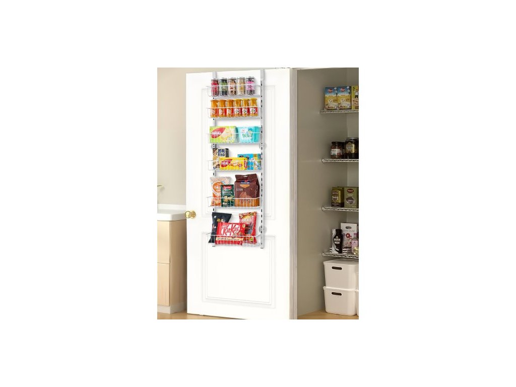 Organizér na spíž nad dveře, 6patrový organizér a úložný prostor na spíž, odolný ocelový závěsný stojan na koření, nastavitelné nástěnné police na koření, pro domácí kuchyň, prádelnu, koupelnu, bílý