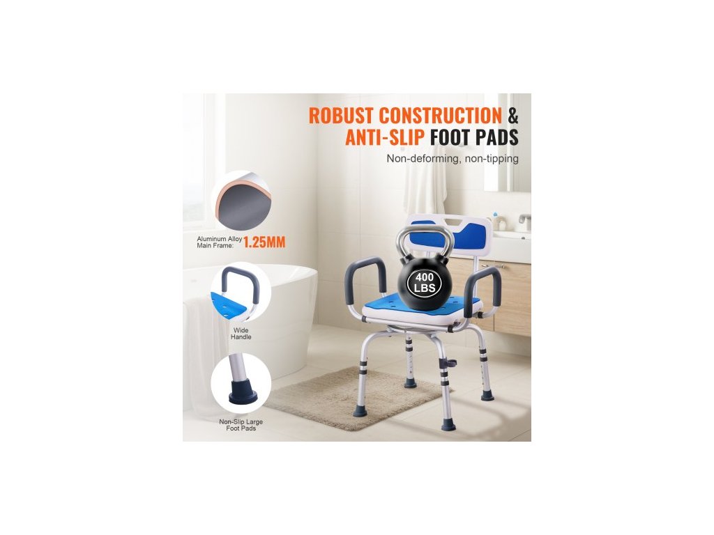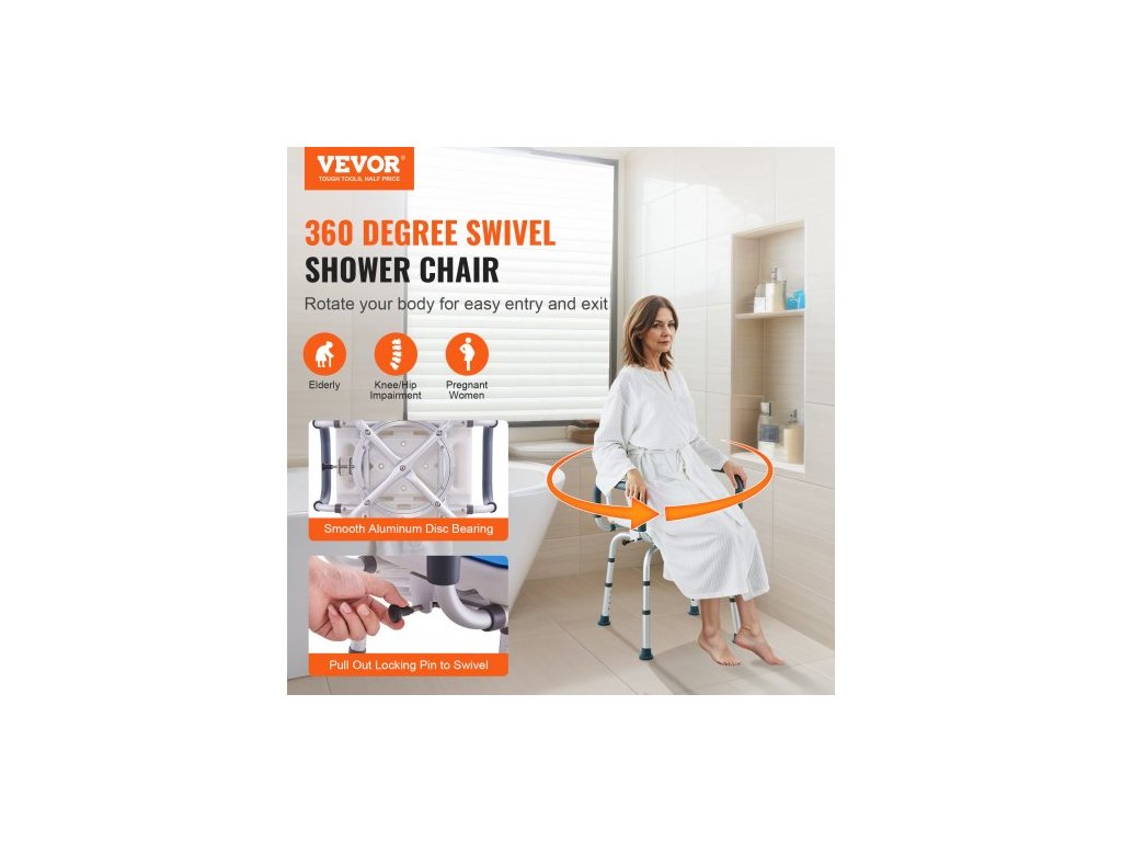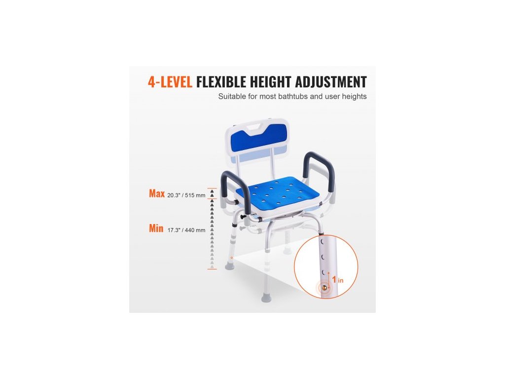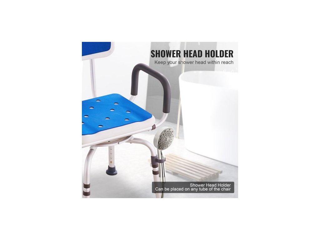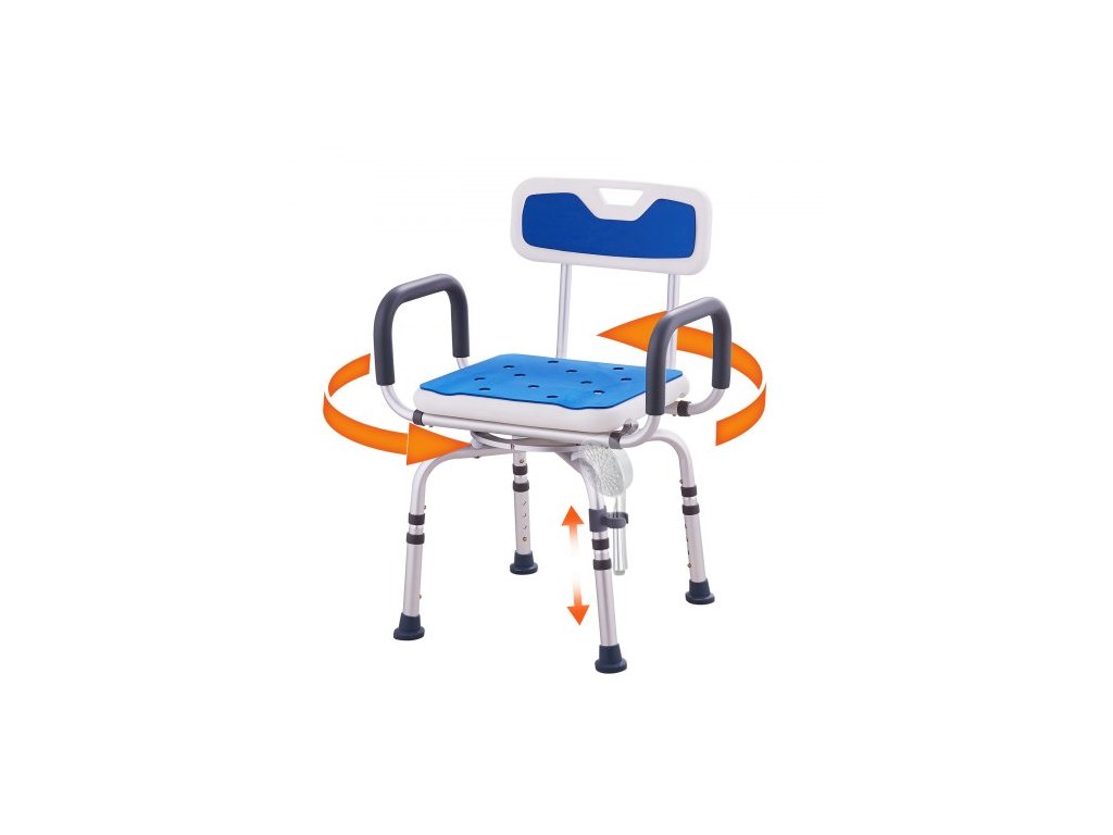 Otočné sprchové křeslo o 360 stupňů, nastavitelné sprchové sedátko s područkami a opěradlem pro sprchování nebo vanu, protiskluzové otočné sedátko do vany pro seniory, osoby se zdravotním postižením a zraněné, nosnost 180 kgNastavitelná výška