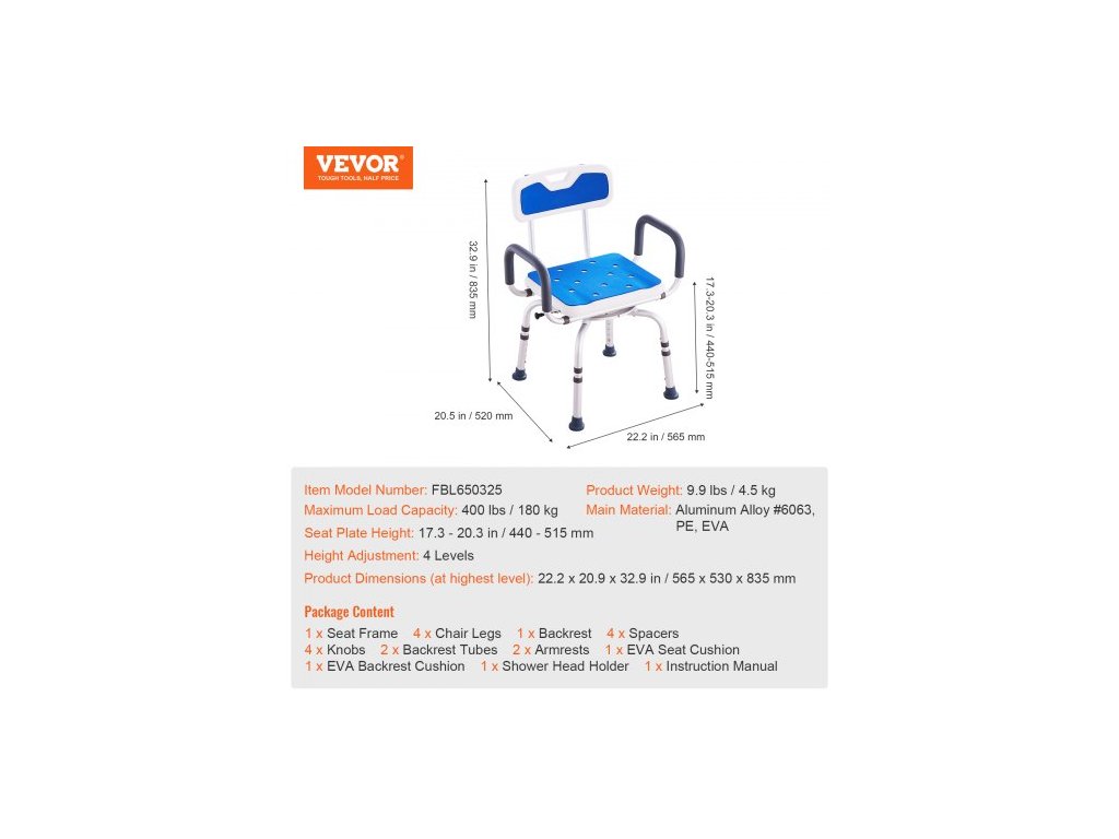 V nejnižší úrovni: 570 x 525 x 770 mm,Nastavení výšky: 4 úrovně (25,2 mm na úroveň),Rozměry opěradla: 410 x 165 x 29 mm,Rozměry sedáku: 405 x 340 x 43 mm Číslo modelu: FBL650325, Maximální nosnost: 180 kg, Hmotnost výrobku: 4,5 kg, V nejvyšší poloze: 565 x 530 x 835 mm, Rozměry výrobku: Hlavní materiál: Hliníková slitina, PE, EVA, Výška sedáku: 440 - 515 mm