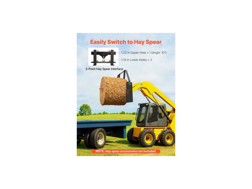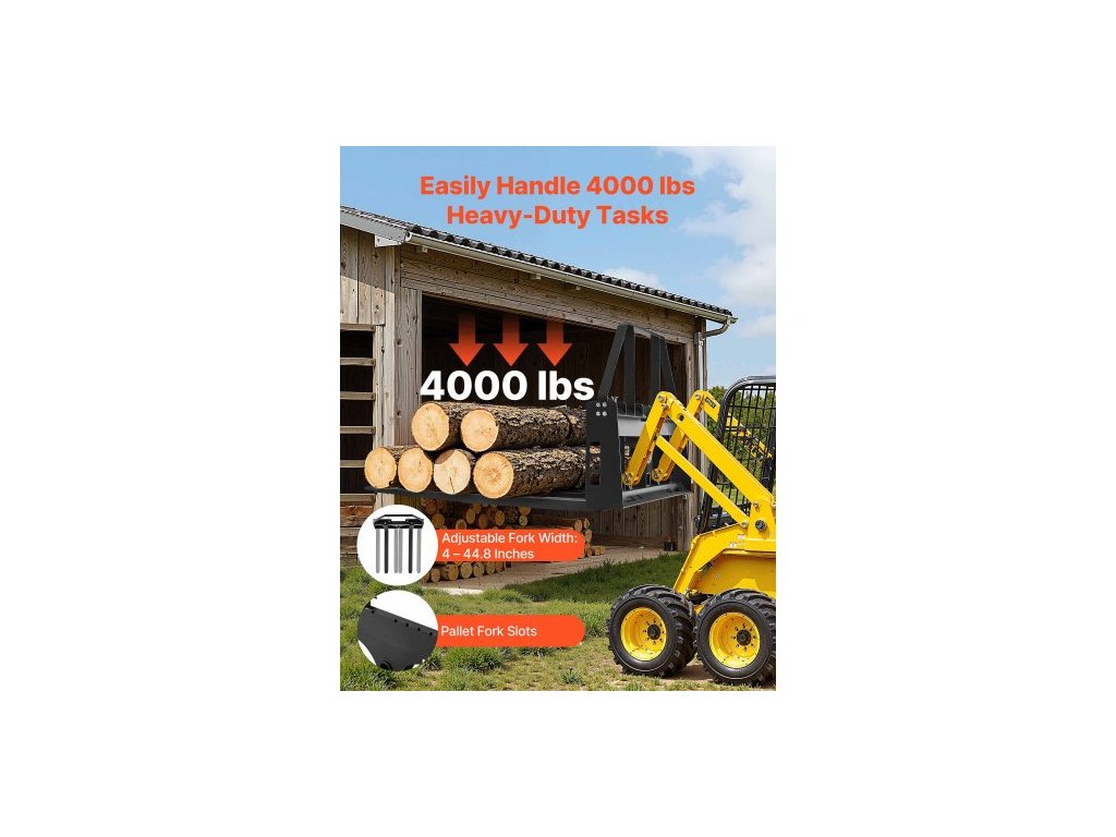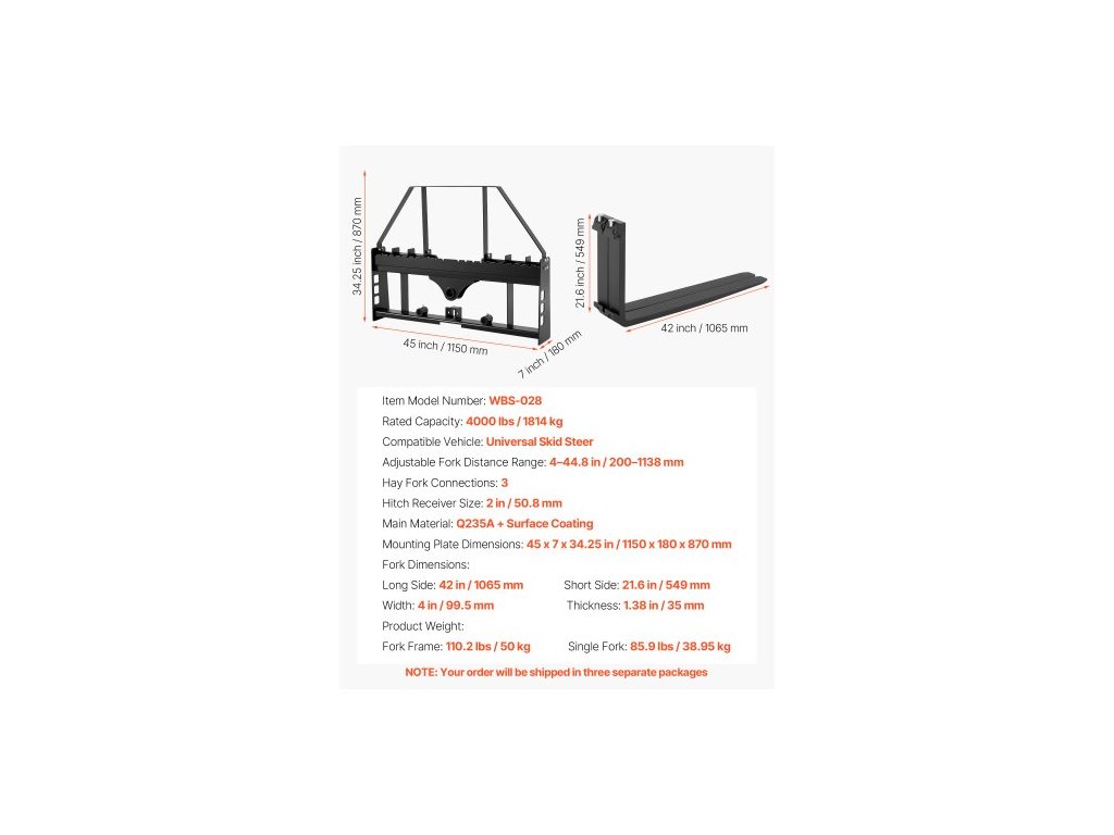 Jmenovitá nosnost: 4000 lbs / 1814 kg,Rám vidlí: 110,2 lbs / 50 kg,Zuby vidlí: 171,7 lbs / 77,9 kg,Rozměry montážní desky: 45 x 7 x 34,25 palce / 1150 x 180 x 870 mm,Připojení vidlí na seno: 3, Tloušťka: 35 mm, Délka: 1065 mm, Velikost uchycení tažného zařízení: 50,8 mm, Rozměry vidlic:, Číslo modelu položky: WBS-028, Hmotnost výrobku:, Krátká strana: 549 mm, Nastavitelný rozsah vzdálenosti vidlic: 50–1138 mm, Šířka: 99,5 mm, Kompatibilní vozidlo: Univerzální smykem řízený nakladač, Hlavní materiál: Q235A + povrchová úprava