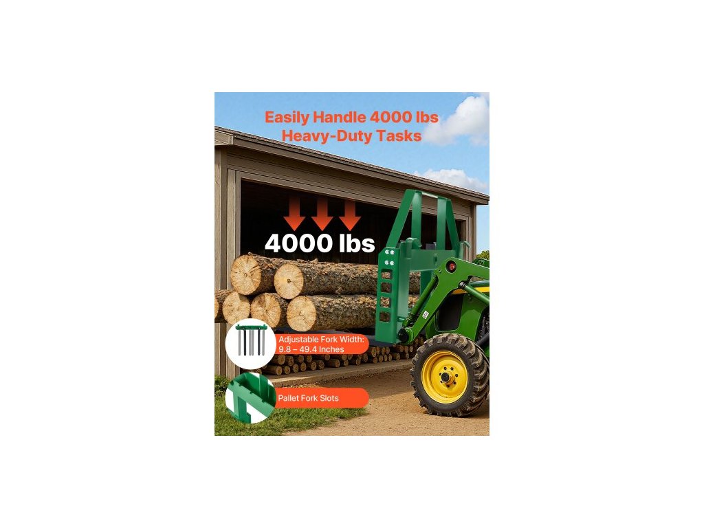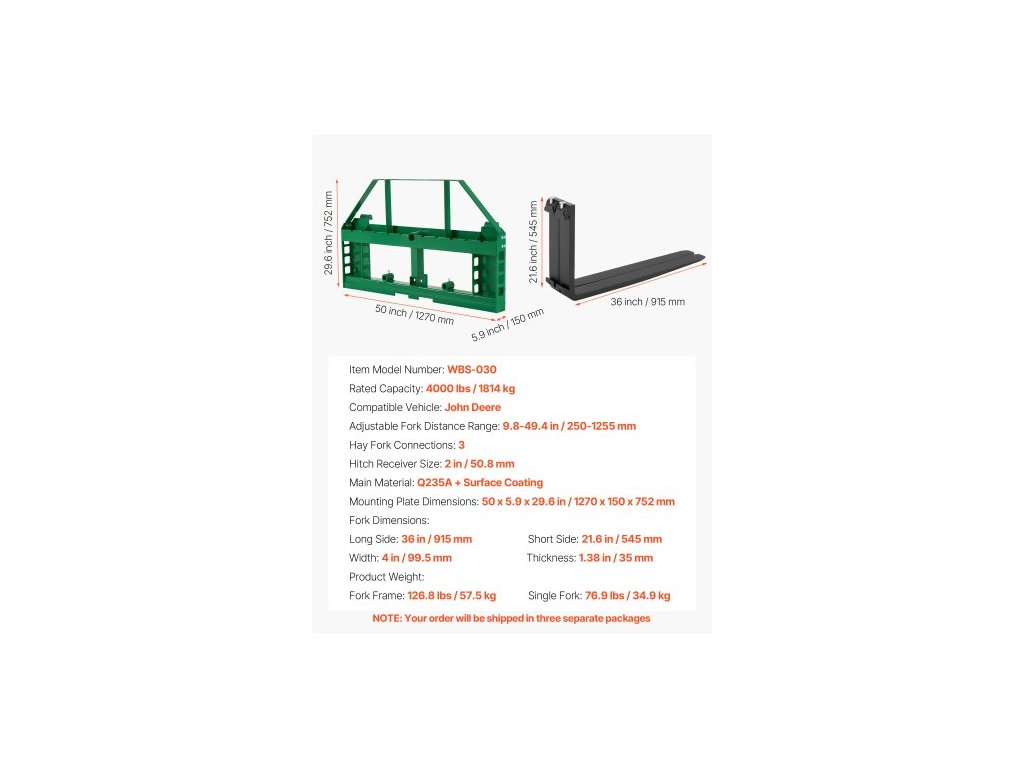 jmenovitá nosnost: 4000 lbs / 1814 kg, rám vidlí: 126,8 lbs / 57,5 kg, hroty vidlí: 153,9 lbs / 69,8 kg, rozměry montážní desky: 50 x 5,9 x 29,6 palce / 1270 x 150 x 752 mm, připojení vidlí na seno: 3, Tloušťka: 1,38 palce / 35 mm, Délka: 36 palců / 915 mm, Velikost uchycení tažného zařízení: 2 palce / 50,8 mm, Rozměry vidlic:, Číslo modelu položky: WBS-030, Hmotnost výrobku:, Krátká strana: 21,5 palce / 545 mm, Nastavitelný rozsah vzdálenosti vidlic: 9,8-49,4 palce / 250-1255 mm, Šířka: 4 palce / 99,5 mm, Kompatibilní vozidlo: Specifický traktor, Hlavní materiál: Q235A + povrchová úprava