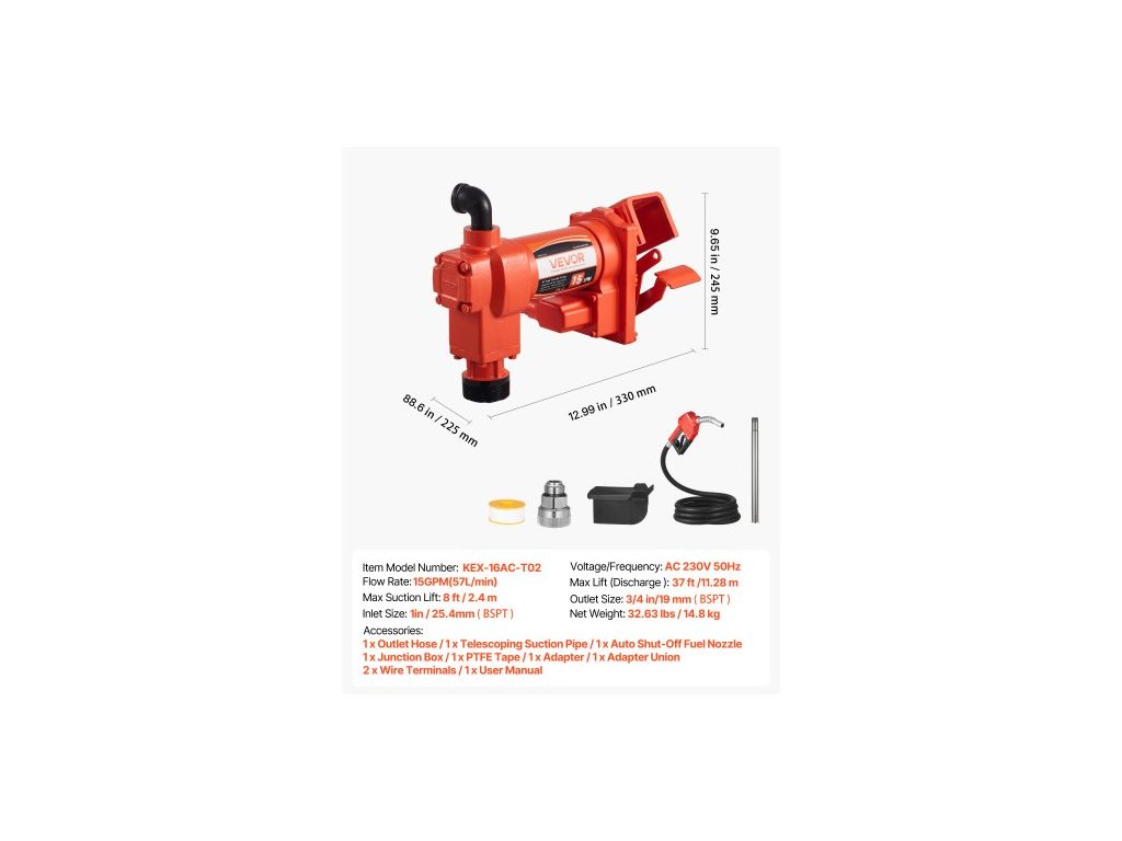 Průtok: 15 GPM/57 l/min,Napětí/frekvence: AC 110-120V, 60Hz,Číslo modelu položky: KEX-16AC-T01,Max. zdvih (výtlačný): 37 stop/11,28 m,Výkon: 0,5HP/380W,Max. sací výška: 8 stop/2,4 m