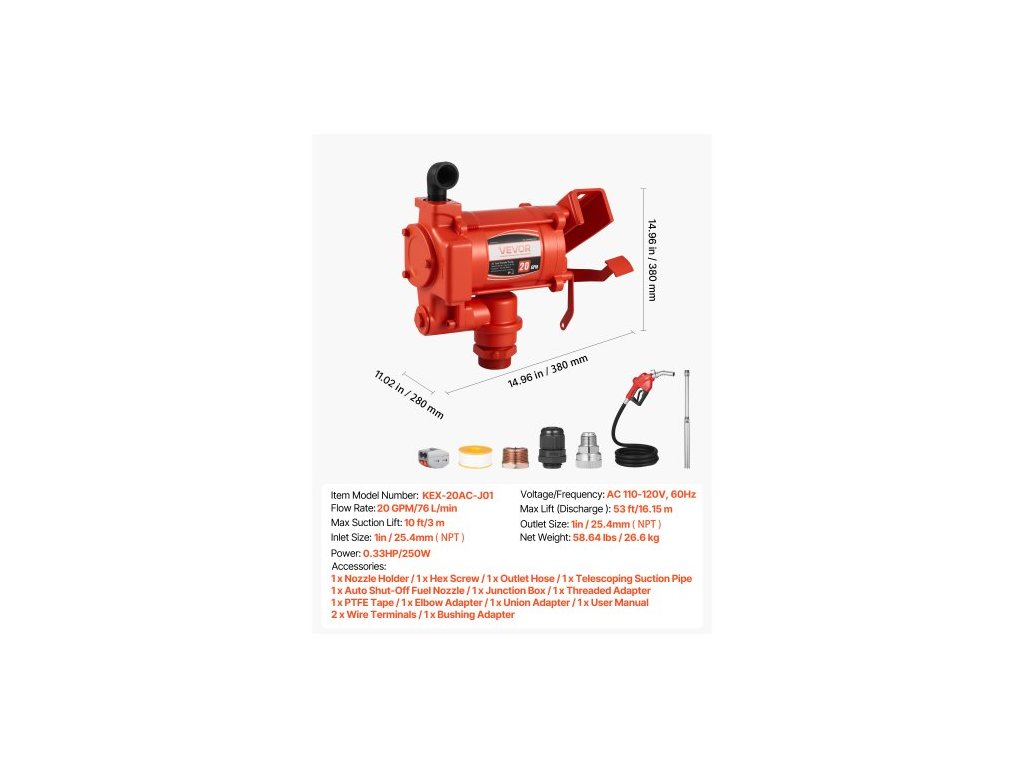 Průtok: 20 GPM/76 l/min,Napětí/frekvence: AC 110-120V, 60Hz,Číslo modelu položky: KEX-20AC-J01,Max. zdvih (výtlačný): 53 stop/16,15 m,Výkon: 0,33HP/250W,Max. sací výška: 10 stop/3 m