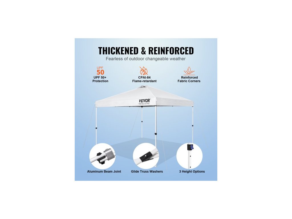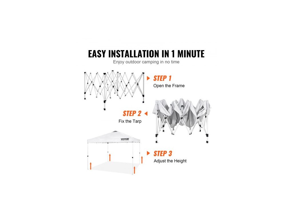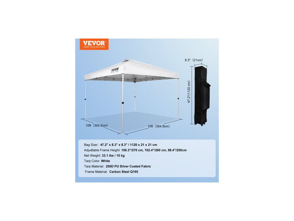 Rozměry po rozložení (D x Š): 10 x 10 stop / 304,8 x 304,8 cm, Nastavitelná výška rámu: 106,3"/270 cm, 102,4"/260 cm, 98,4"/250 cm, Barva plachty: Bílá, Materiál rámu: Uhlíková ocel Q195, Čistá hmotnost: 33,1 lbs / 15 kg, Velikost tašky: 47,2" x 8,3" x 8,3" / 1120 x 21 x 21 cm, materiál plachty: 250D PU stříbrně potažená tkanina