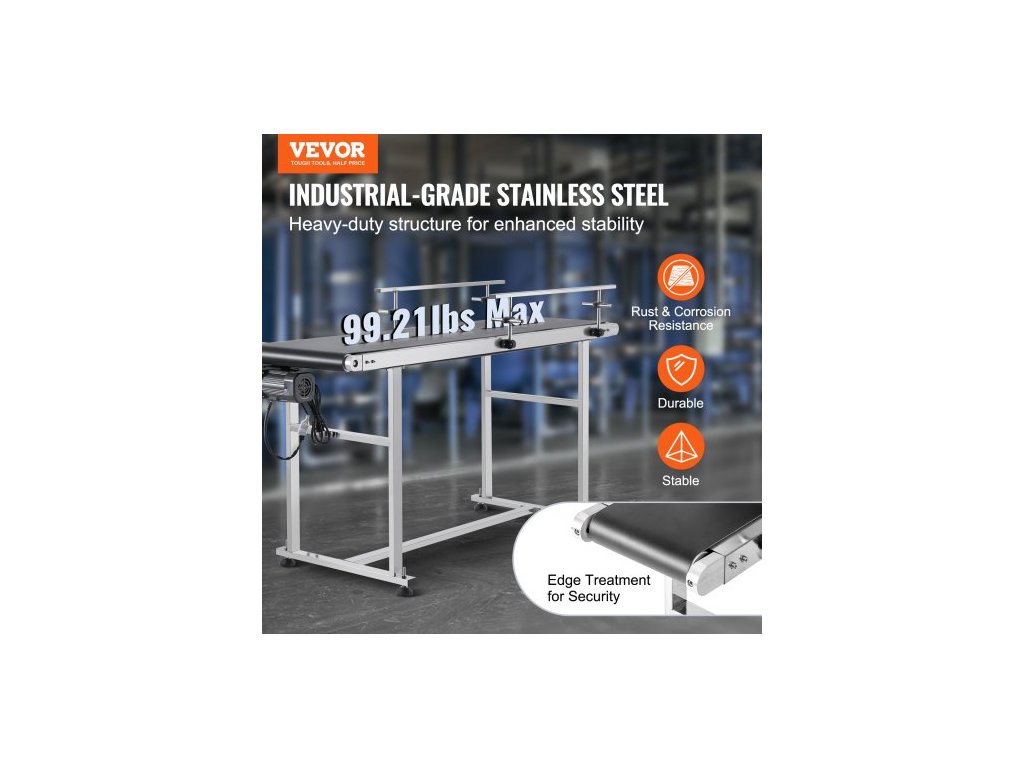 Nosnost: 99,21 lbs/45 kg,Číslo modelu položky: MS15040,Hmotnost výrobku: 53,35 lbs/24,2 kg,Materiál: Nerezová ocel 201,Rychlost dopravního pásu: Obousměrná proměnná rychlost, 25 m/min,Rozměry pásu: 59 x 15,7 palců/1498,6 x 398,8 mm,Šířka stolu: 17,7 palců/450 mm,Rozměry výrobku: 58,66 x 22,05 x 35,91 palce / 1490 x 560 x 912 mm