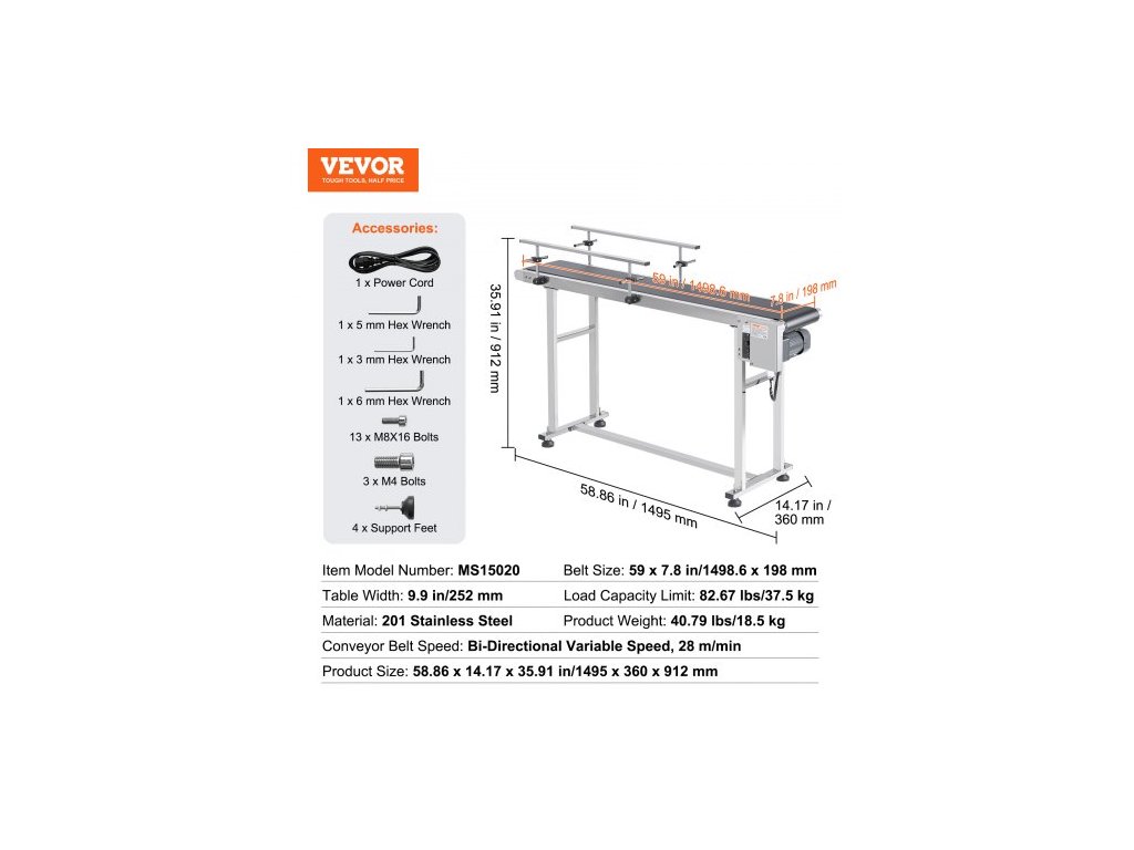 Nosnost: 82,67 lbs/37,5 kg,Číslo modelu položky: MS15020,Hmotnost výrobku: 40,79 lbs/18,5 kg,Materiál: Nerezová ocel 201,Rychlost dopravního pásu: Obousměrná proměnná rychlost, 28 m/min,Rozměry pásu: 59 x 7,8 palce/1498,6 x 198,1 mm,Šířka stolu: 9,9 palce/252 mm,Rozměry výrobku: 58,86 x 14,17 x 35,91 palce / 1495 x 360 x 912 mm
