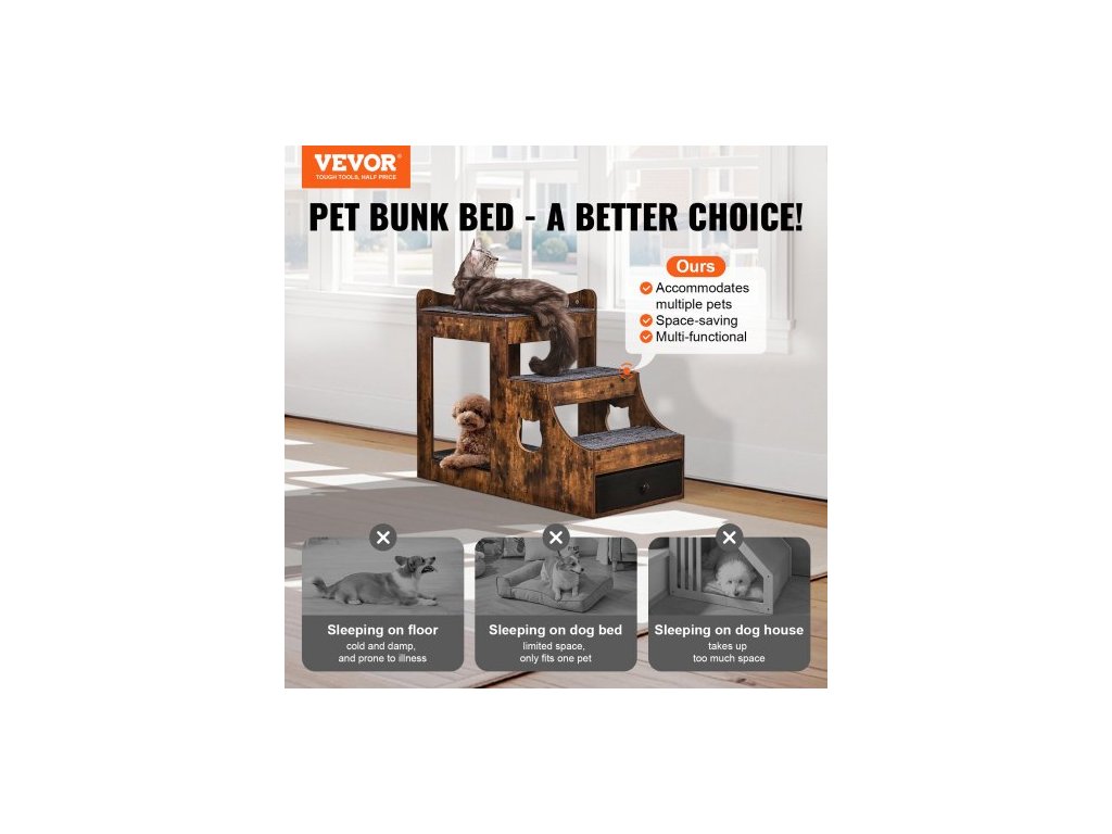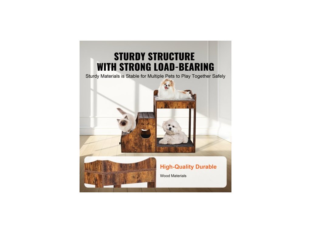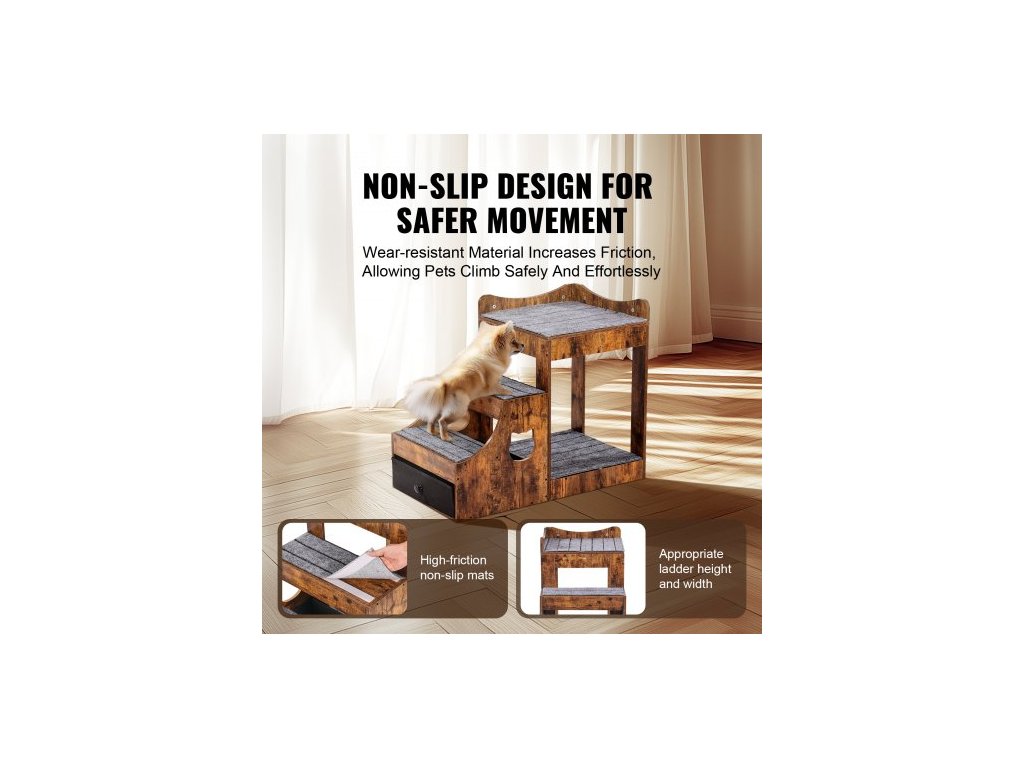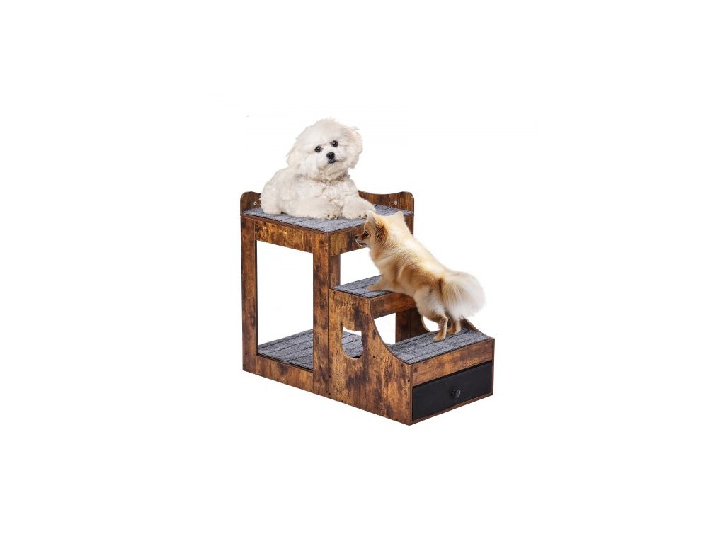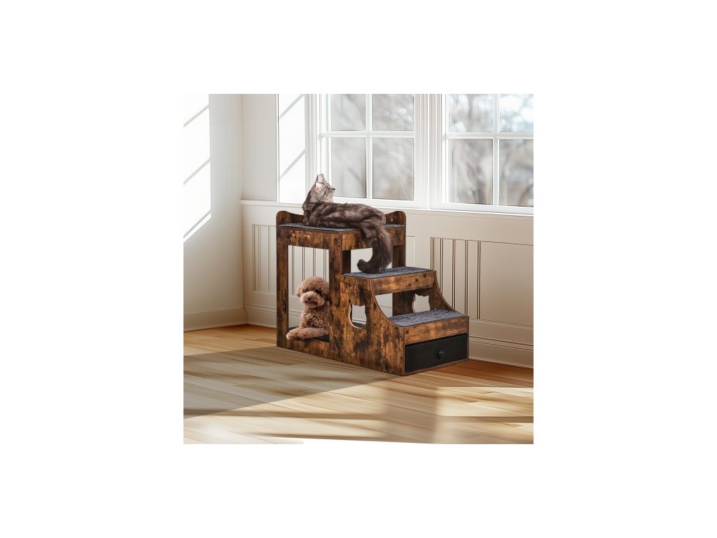Patrová postel pro domácí mazlíčky s odnímatelnými schody, okenní bidýlko pro psy/kočky s úložným prostorem, víceúrovňová postel, okenní bidýlko, noční gauč pro psy, plošina pro malé domácí mazlíčky, vnitřní použití (rustikální hnědá)Multifunkční pelíšek pro domácí mazlíčky