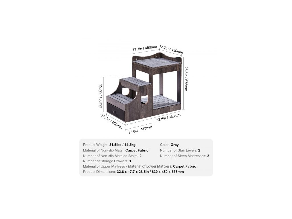 Materiál spodní matrace: Kobercová tkanina,Počet matrací na spaní: 2,Počet úrovní schodů: 2,Materiál protiskluzových podložek: Kobercová tkanina,Barva: Šedá,Číslo modelu položky: LT-MKT02,Hmotnost výrobku: 31,5 liber / 14,3 kg,Specifikace: Malá,Rozměry výrobku (D x Š x V): 32,6 x 17,7 x 26,5 palce / 830 x 450 x 675 mm,Počet protiskluzových podložek na schodech: 3,Počet úložných zásuvek: 1, Materiál horní matrace: Kobercová tkanina