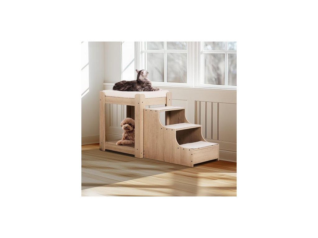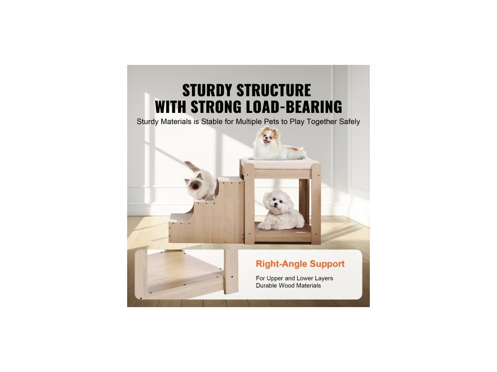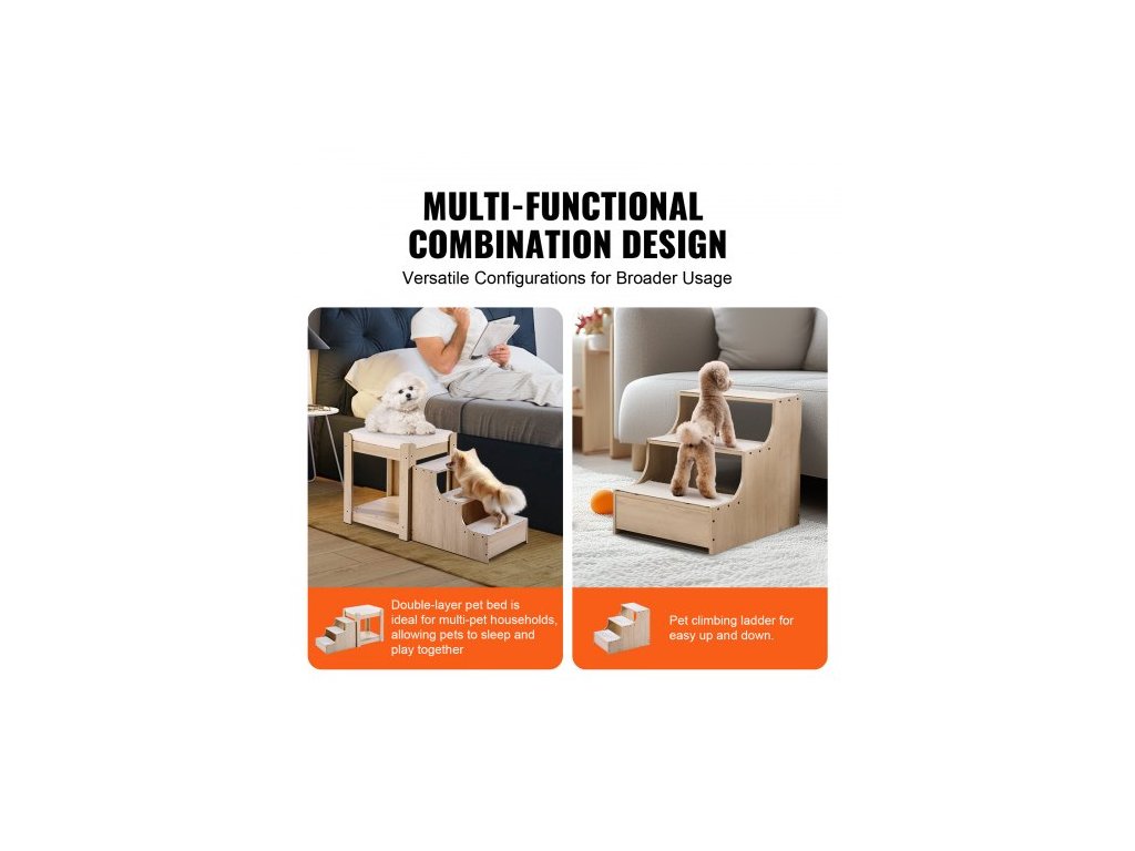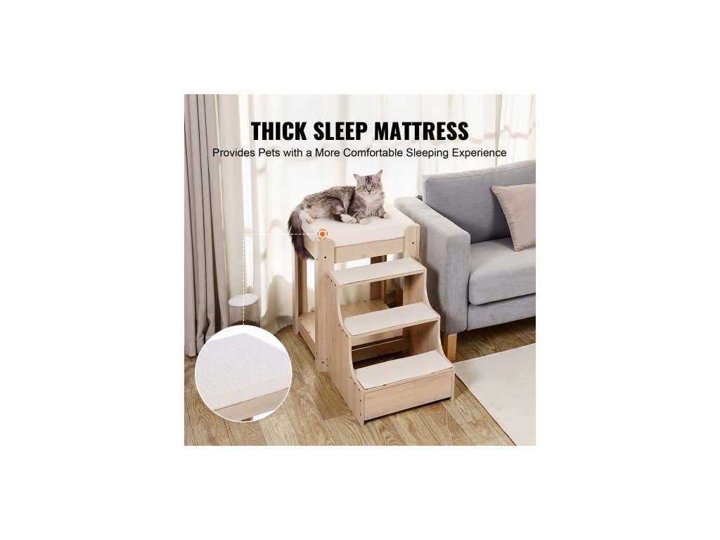 Patrová postel pro domácí mazlíčky se schody, okenní bidýlko pro psy/kočky, víceúrovňová postel s okenním bidýlkem a nočním stolkem pro psy, vyvýšená sedací plošina s pěnovým polštářem, pohovka s pelíškem pro použití u postele v interiéru (béžová)Multifunkční pelíšek pro domácí mazlíčky