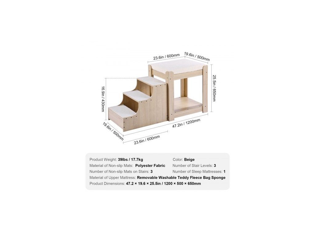 Počet matrací na spaní: 1,Počet úrovní schodů: 3,Materiál protiskluzových podložek: Polyesterová tkanina,Barva: Béžová,Číslo modelu položky: 099-1A,Hmotnost výrobku: 17,7 kg,Specifikace: Malá,Rozměry výrobku (D x Š x V): 1200 x 500 x 650 mm,Počet protiskluzových podložek na schodech: 3,Materiál horní matrace:Odnímatelná Pratelný fleecový sáček Teddy