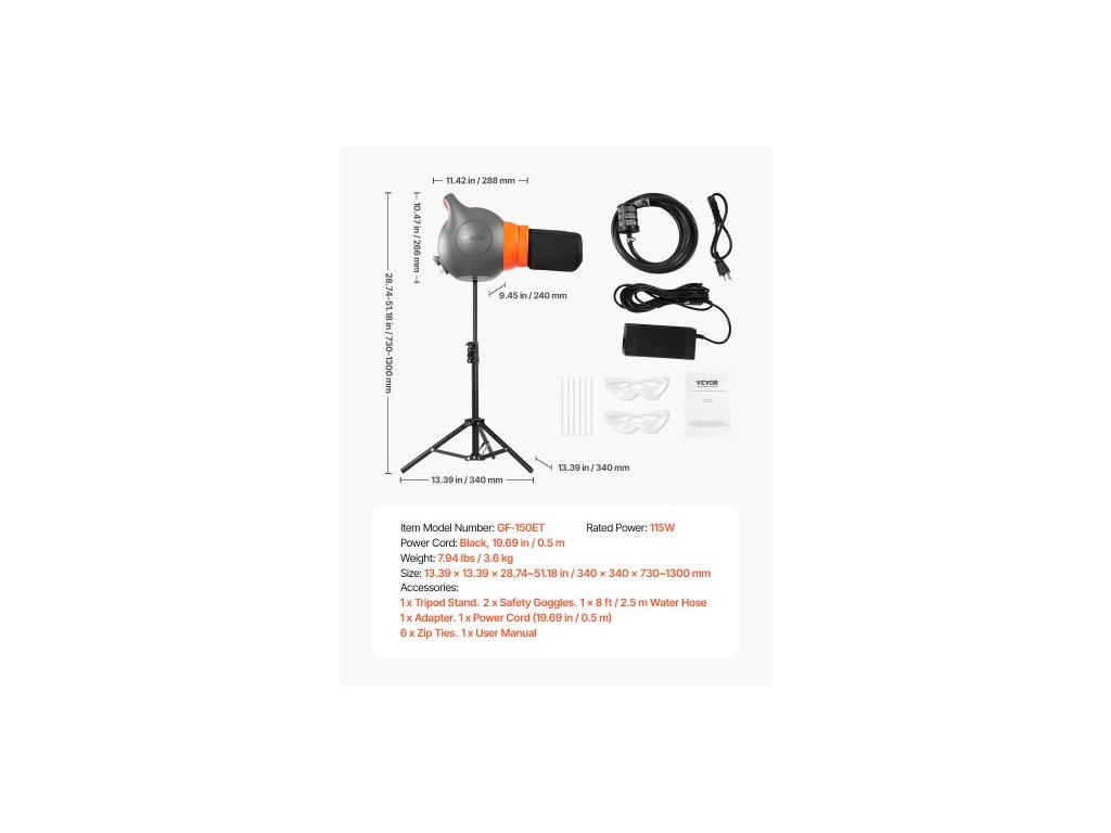 Napájecí kabel: Černý, 0,5 m,Rozměry: 340 x 340 x 730~1300 mm,Číslo modelu položky: GF-150ET,Jmenovitý výkon: 115 W,Hmotnost: 3,6 kg