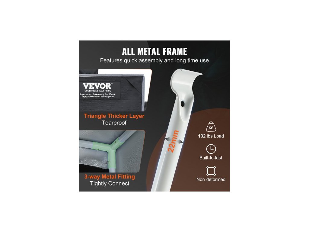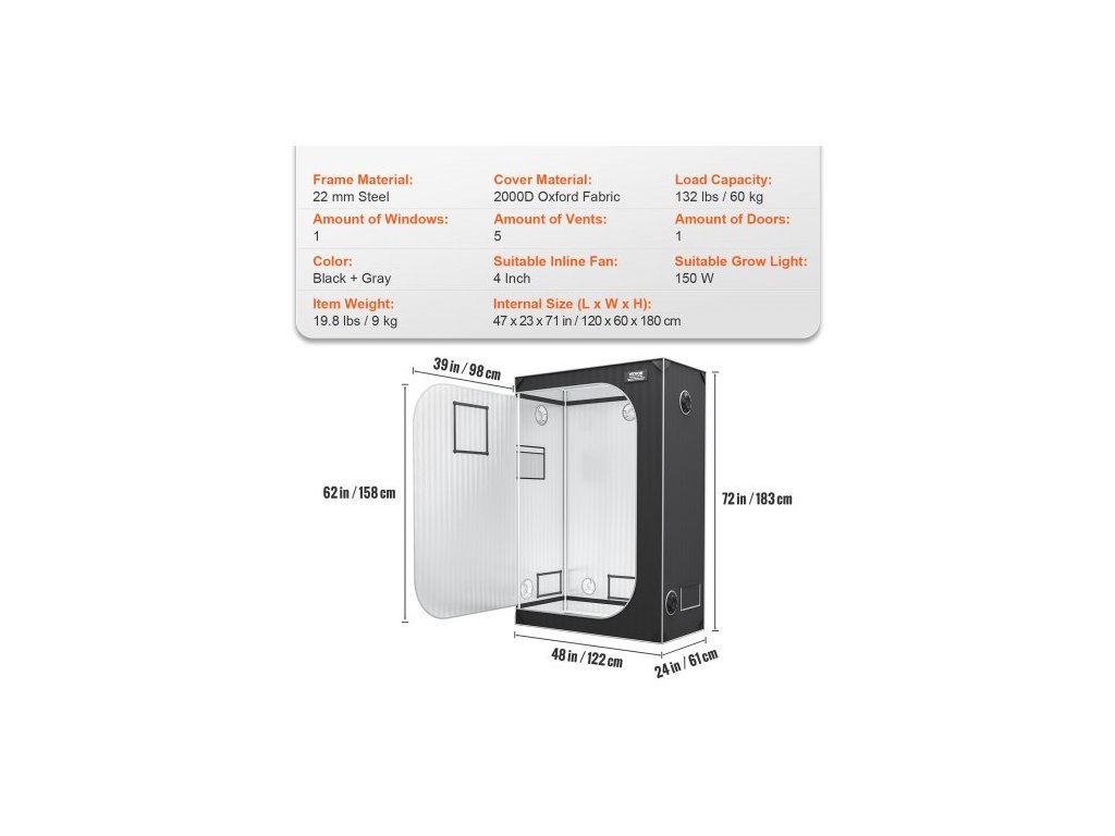 Vnitřní rozměry (D x Š x V): 47 x 23 x 71 palců / 120 x 60 x 180 cm,Vhodný řadový ventilátor: 4 palce,Nosnost: 132 lbs / 60 kg,Vhodné pěstební světlo: 150 W,Rozměry položky (D x Š x V): 48 x 24 x 72 palců / 122 x 61 x 183 cm,Barva: Černá + šedá,Číslo modelu položky: GT2000D24, Materiál potahu: Oxfordská tkanina 2000D, Materiál rámu: Ocel 22 mm, Rozměry dveří (D x Š): 62 x 39 palců / 158 x 98 cm, Hmotnost položky: 19,8 lbs / 9 kg