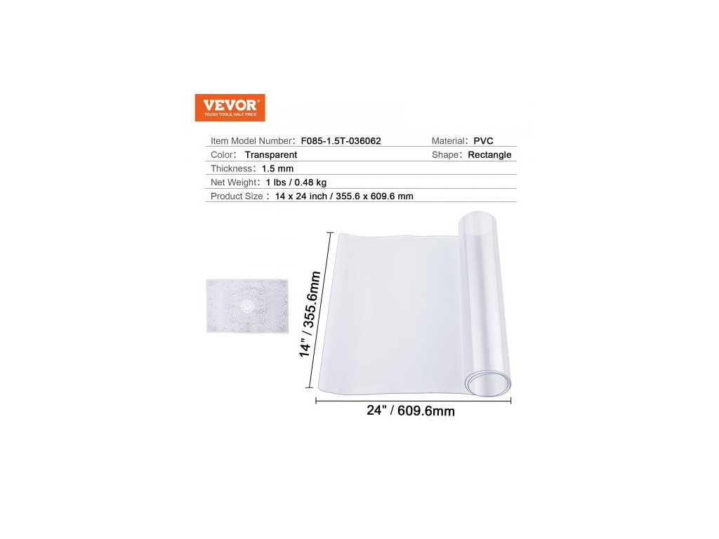 Tloušťka: 1,5 mm,Tvar: Obdélník,Rozměr chrániče stolu: 14x24 palců / 355,6x609,6 mm,Barva: Průhledná,Číslo modelu položky: F085-1.5T-036062,Materiál: PVC,Čistá hmotnost: 1 libra / 0,48 kg