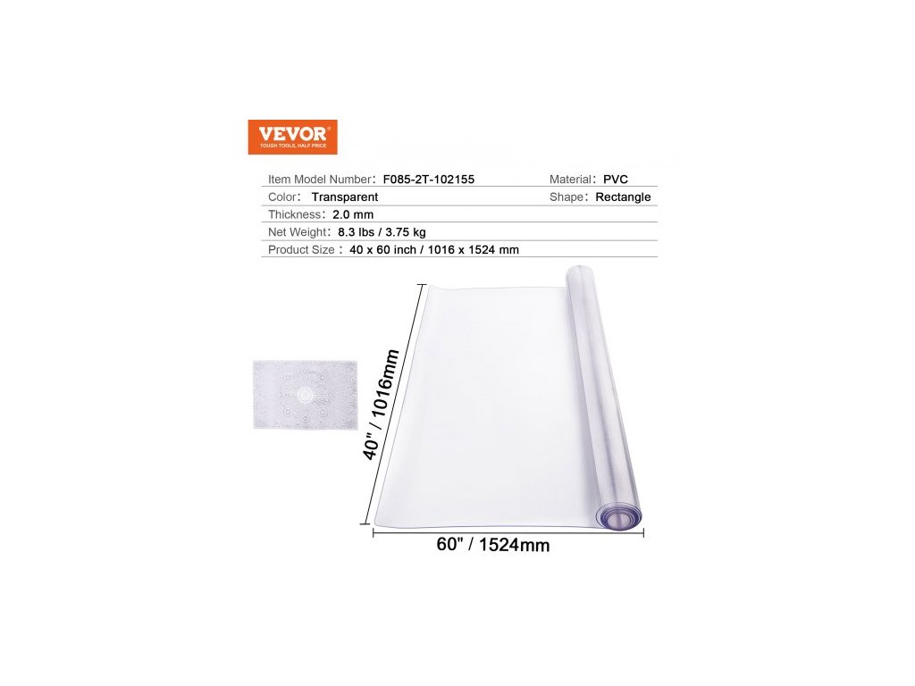 Tloušťka: 2,0 mm,Tvar: Obdélník,Rozměr chrániče stolu: 40x60 palců / 1016x1524 mm,Barva: Průhledná,Číslo modelu položky: F085-2T-102155,Materiál: PVC,Čistá hmotnost: 8,3 lbs / 3,75 kg