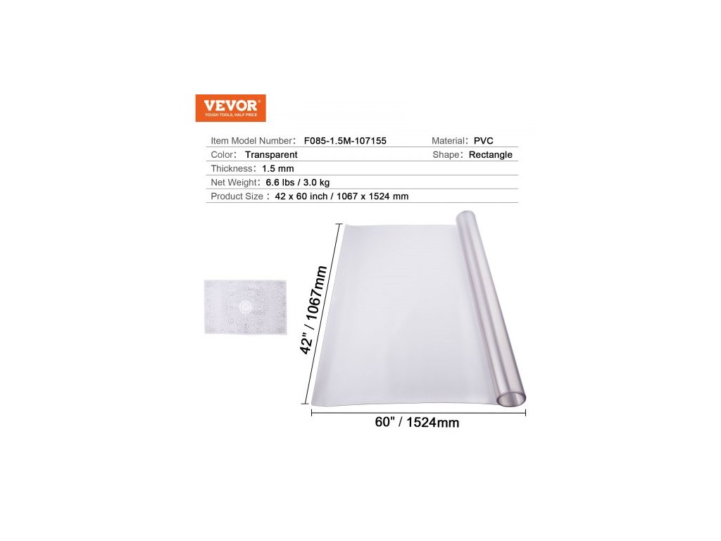 Tloušťka: 1,5 mm,Tvar: Obdélník,Rozměr chrániče stolu: 42x60 palců / 1067x1524 mm,Barva: Průhledná,Číslo modelu položky: F085-1.5M-107155,Materiál: PVC,Čistá hmotnost: 6,6 lbs / 3,0 kg