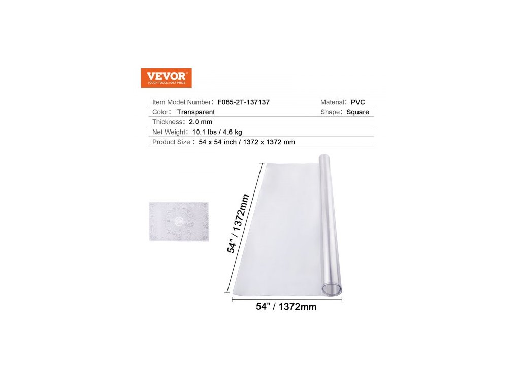 Tloušťka: 2,0 mm,Tvar: Čtvercový,Rozměr chrániče stolu: 54x54 palců / 1372x1372 mm,Barva: Průhledná,Číslo modelu položky: F085-2T-137137,Materiál: PVC,Čistá hmotnost: 10,1 lbs / 4,6 kg