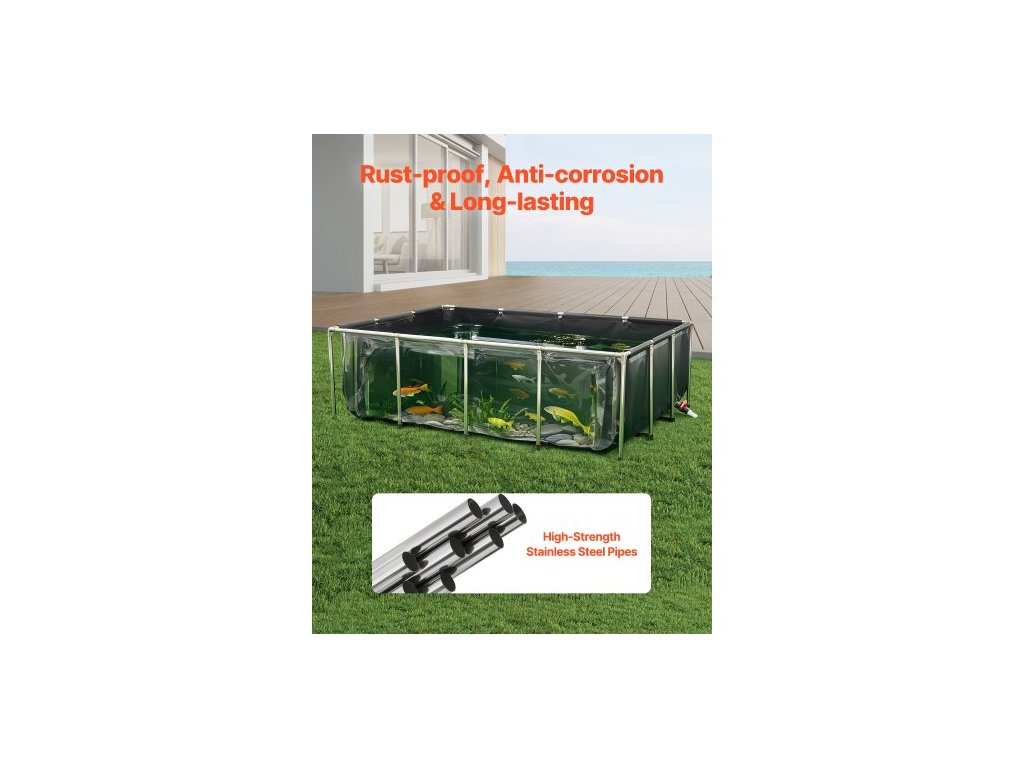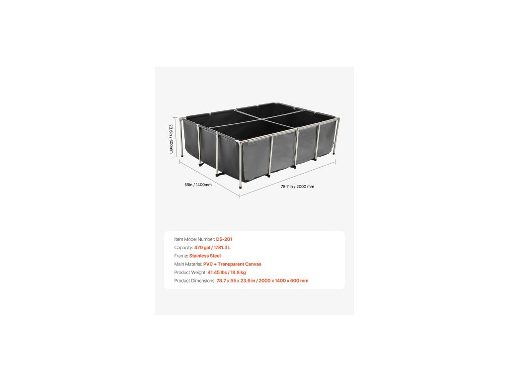 Rám: Nerezová ocel,Objem: 470 gal / 1781,3 l,Číslo modelu položky: DS-201,Hmotnost výrobku: 41,45 lbs / 18,8 kg,Rozměry výrobku: 78,7 x 55 x 23,6 palce / 2000 x 1400 x 600 mm,Hlavní materiál: PVC + průhledné plátno