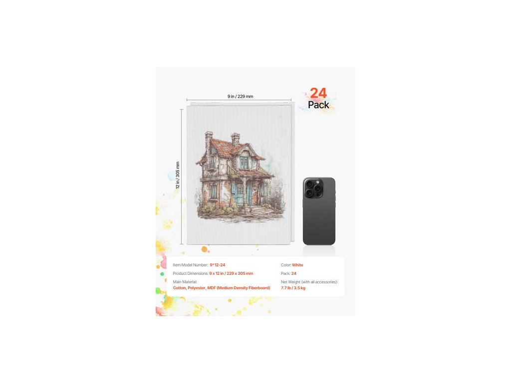 Barva: Bílá, Číslo modelu položky: 9*12-24, Rozměry produktu: 9 x 12 palců / 229 x 305 mm, Balení: 24, Čistá hmotnost (s veškerým příslušenstvím): 7,7 lb / 3,5 kg, Hlavní materiál: Bavlna, Polyester, MDF (dřevovláknitá deska střední hustoty)