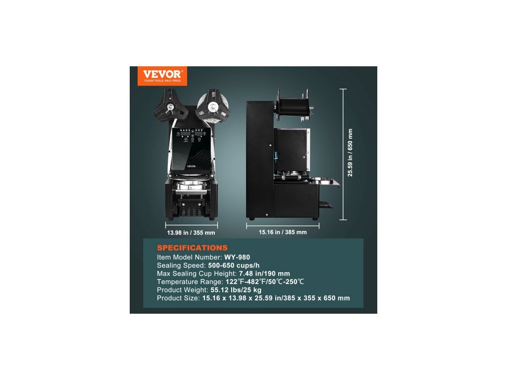 Rychlost zatavování: 500–650 šálků/h,Číslo modelu: WY-980,Hmotnost výrobku: 25 kg,Maximální výška zatavovacího kelímku: 190 mm,Teplotní rozsah: 50–250 °C,Rozměry výrobku: 385 x 355 mm x 650 mm