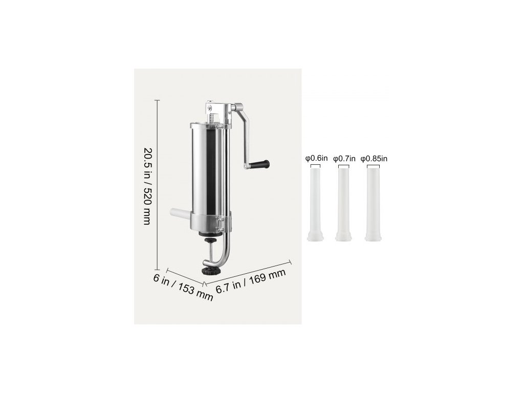 Výtlačná trubice a přítlačná deska: Potravinářský PP, Typ: Vertikální, Kapacita: 3 l, Celková velikost stroje: 520 x 153 x 169 mm, Model: ES-3L, Materiál válce: SUS304 (potravinářská kvalita), Ovládání: Ruční, Rozměry trubice: φ0,63 palce / 16 mm, φ0,75 palce / 19 mm, φ0,87 palce / 22 mm, Čistá hmotnost: 7,7 liber / 3,5 kg, Dno sudu: Hliník (potravinářský)