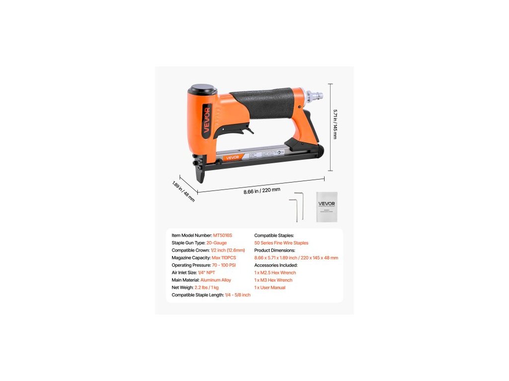 Provozní tlak: 70 - 100 PSI,Typ sešívačky: 20-Gauge,Kompatibilní délka sponek: 1/4 - 5/8 palce,Kapacita zásobníku: Max. 110 ks,Číslo modelu položky: MT5016S,Šířka kompatibilní korunky: 1/2 palce,Velikost vstupu vzduchu: 1/4" NPT,Kompatibilní sponky: Sponky z jemného drátu řady 50,Rozměry produktu: 8,66 x 5,71 x 1,89 palce / 220 x 145 x 48 mm, Čistá hmotnost: 2,2 lb / 1 kg, Hlavní materiál: Hliníková slitina