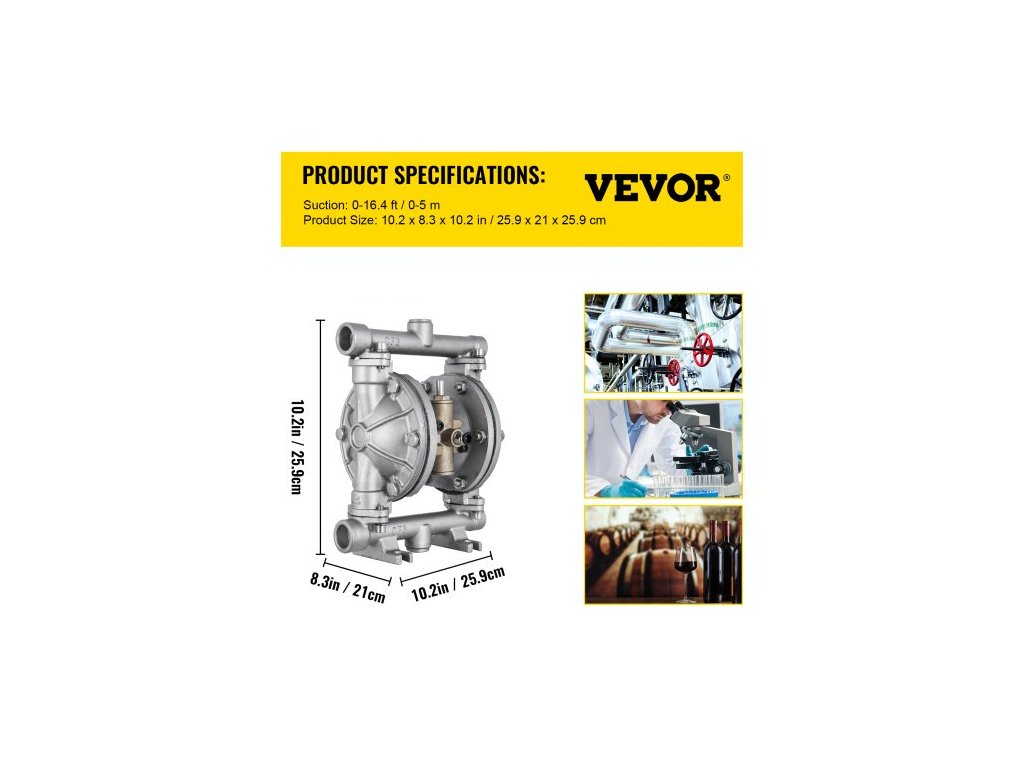 Sání: 0–5 m (0–16,4 stop),Výstupní otvor: 1/2 palce (12,7 mm),Vstupní otvor: 1/2 palce (12,7 mm),Max. suspendované látky: 1/8 palce (3,18 mm),Velikost vstupu vzduchu: 1/4 palce (6,35 mm),Plynová tryska: 0,32 palce (8 mm),Max. průtok: 3 GPM,Materiál tělesa čerpadla: Nerezová ocel,Max. Teplota kapaliny: 122 ℉, Model: QBK-15P, Max. tlak: 90 psi, Průměrná spotřeba vzduchu: 10 CFM, Max. dopravní výška: 196,85 stop/60 m ± 15 %