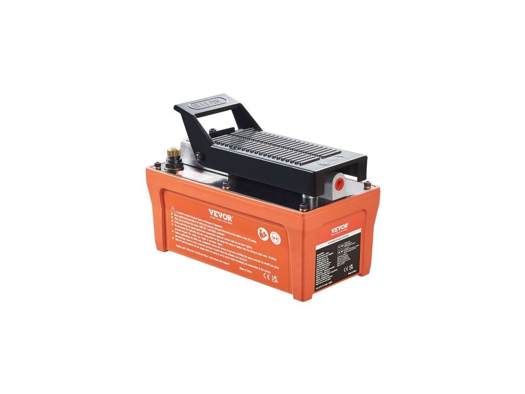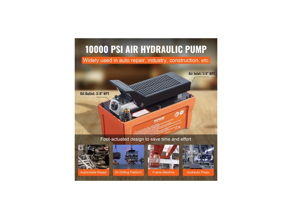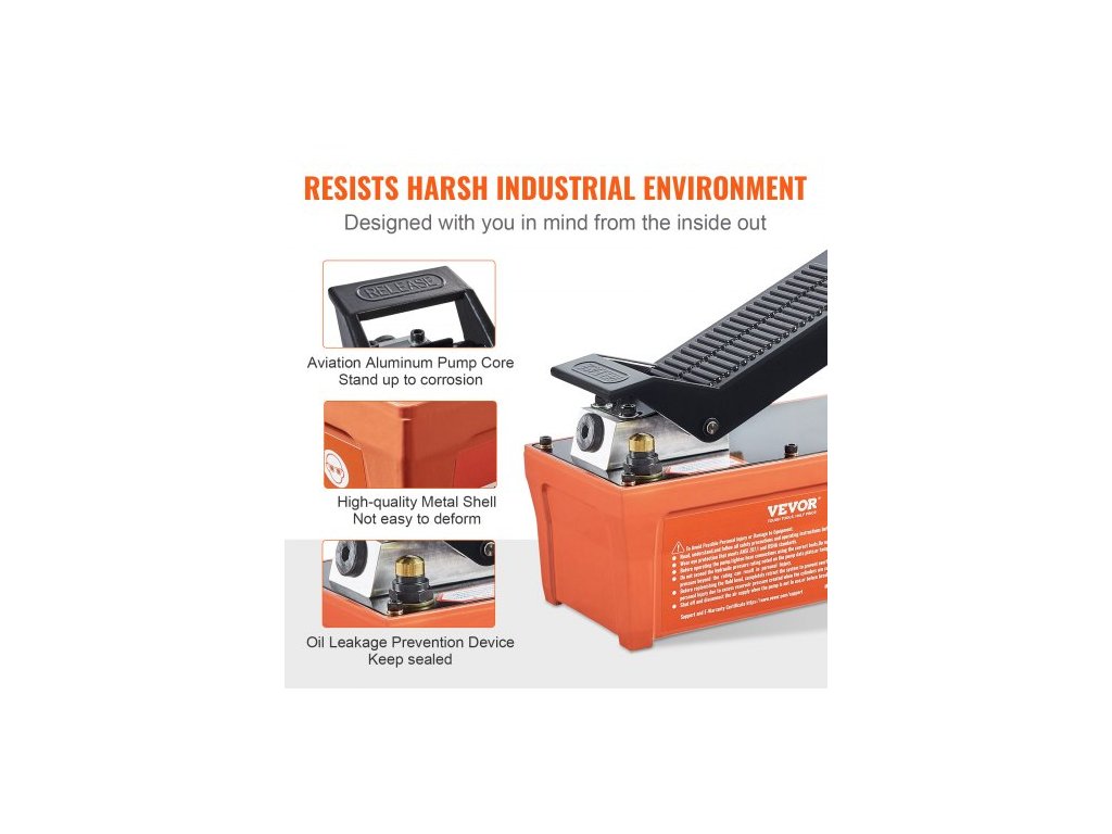 Pneumatické hydraulické čerpadlo , nádržka 6895 barů, objem 1,9 l, výstup oleje NPT 10 mm, vstup NPT 6,4 mm, trubka 2 m, nožně ovládaný hydraulický pedál pro stroje na karoserii a tažné sloupky, oranžováVstup vzduchu NPT 1/4"