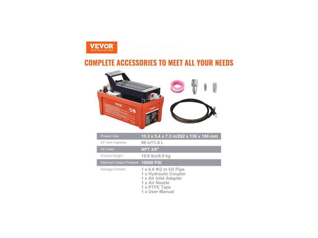 Průtok hydraulického čerpadla: 0,8 l/min (bez zátěže); 0,16 l/min (zatížení), Rozsah vstupního tlaku vzduchu: 110 PSI-145 PSI, Rozměry výrobku (D x Š x V): 10,3 x 5,4 x 7,3 palce/262 x 136 x 186 mm, Přívod vzduchu: NPT 1/4", Model: NAP002, Hmotnost výrobku: 19,6 lbs/8,9 kg, Objem olejové nádrže: 98 in³/1,6 l, Maximální výstupní tlak: 10 000 PSI, Výstup oleje: NPT 3/8"