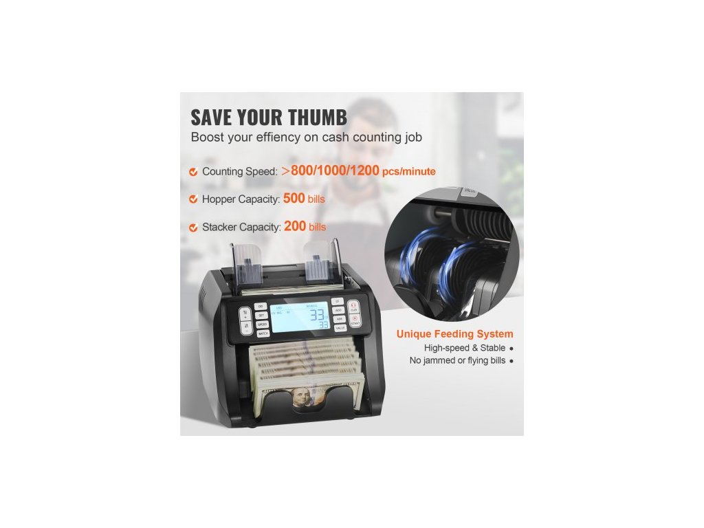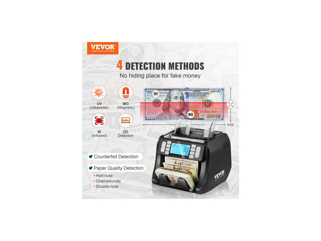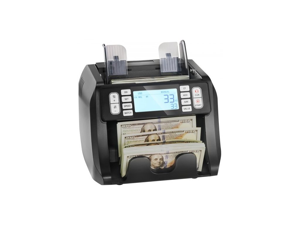 Počítačka bankovek , počítačka bankovek s UV, MG, IR a DD detekcí padělků, počítání bankovek v USD a EUR s režimy sčítání a dávkování, velký LCD a externí displejPřesná a precizní detekce