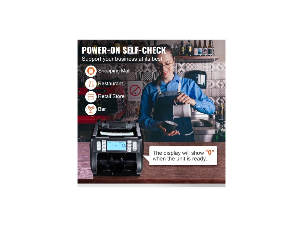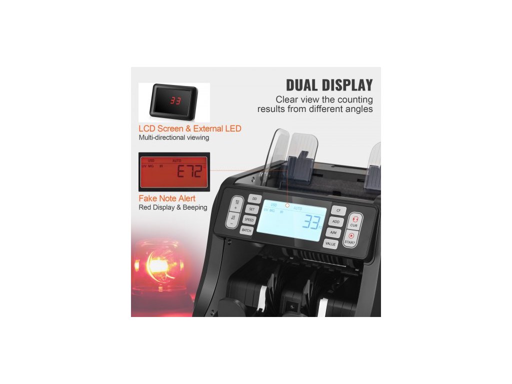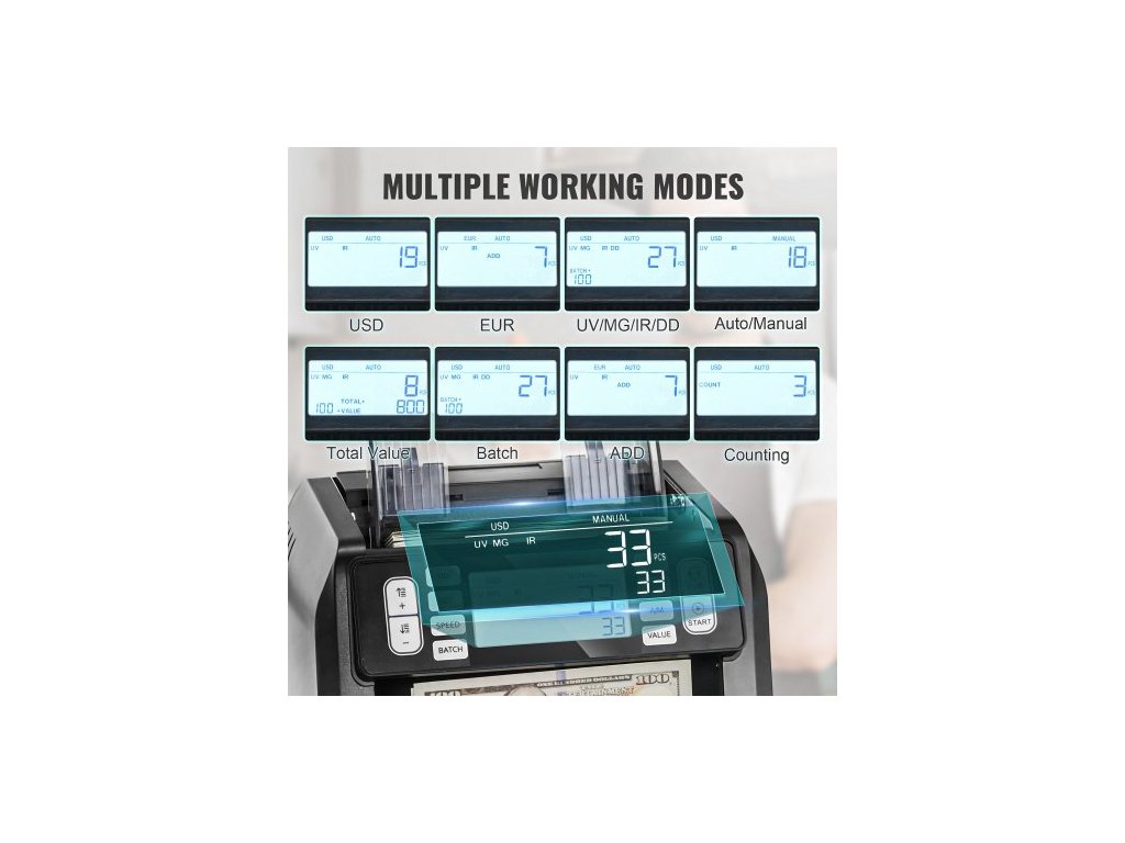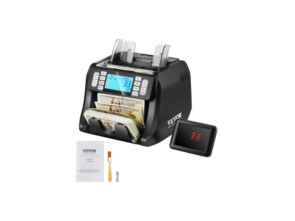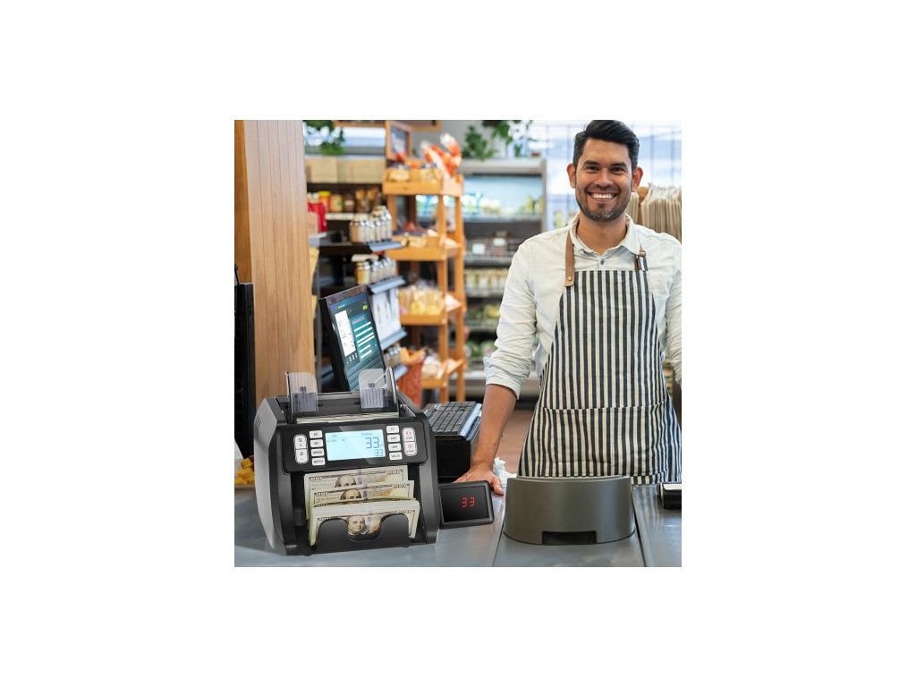 Počítačka bankovek , počítačka bankovek s UV, MG, IR a DD detekcí padělků, počítání bankovek v USD a EUR s režimy sčítání a dávkového počítání, velký LCD a externí displej