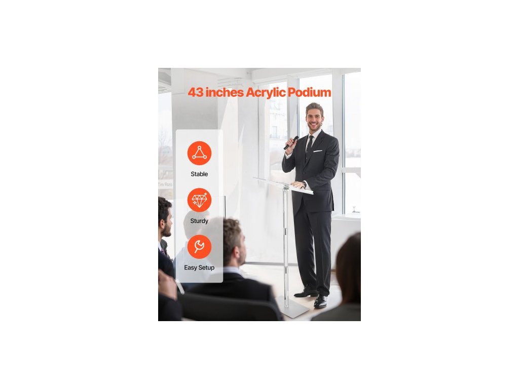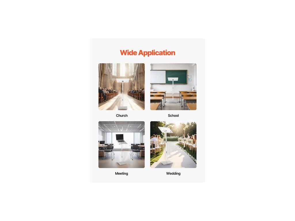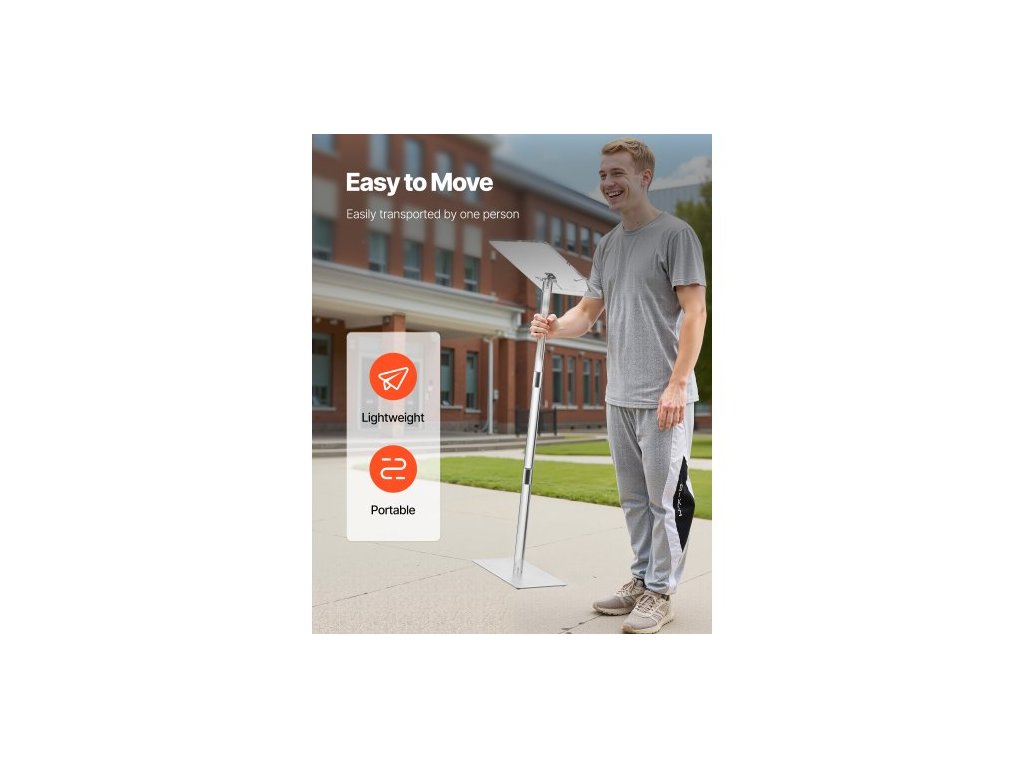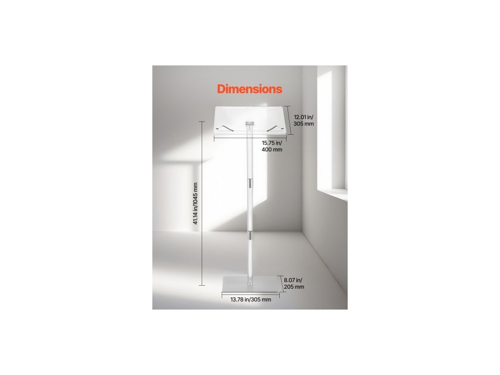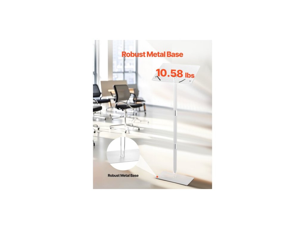 Pódiový stojan , akrylový pultík 1100 mm, přenosný stůl na notebook se širokou čtecí plochou, klipy na knihy, nastavitelný úhel, stojící na podlaze, pro učebny, svatby, konference, přednášky a koncerty