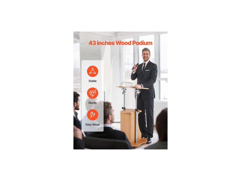 Pódiový stojan , dřevěný pultík 1100 mm, přenosný stůl na notebook s uzamykatelnými kolečky, široká čtecí plocha a otevřený úložný prostor, nastavitelná výška a úhel, pro projevy, přednášky nebo prezentace