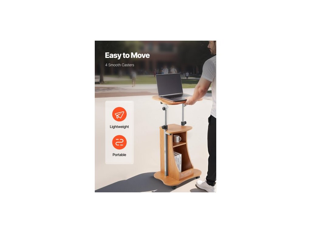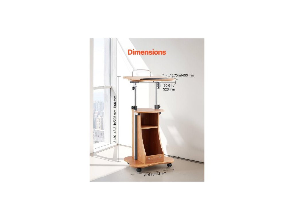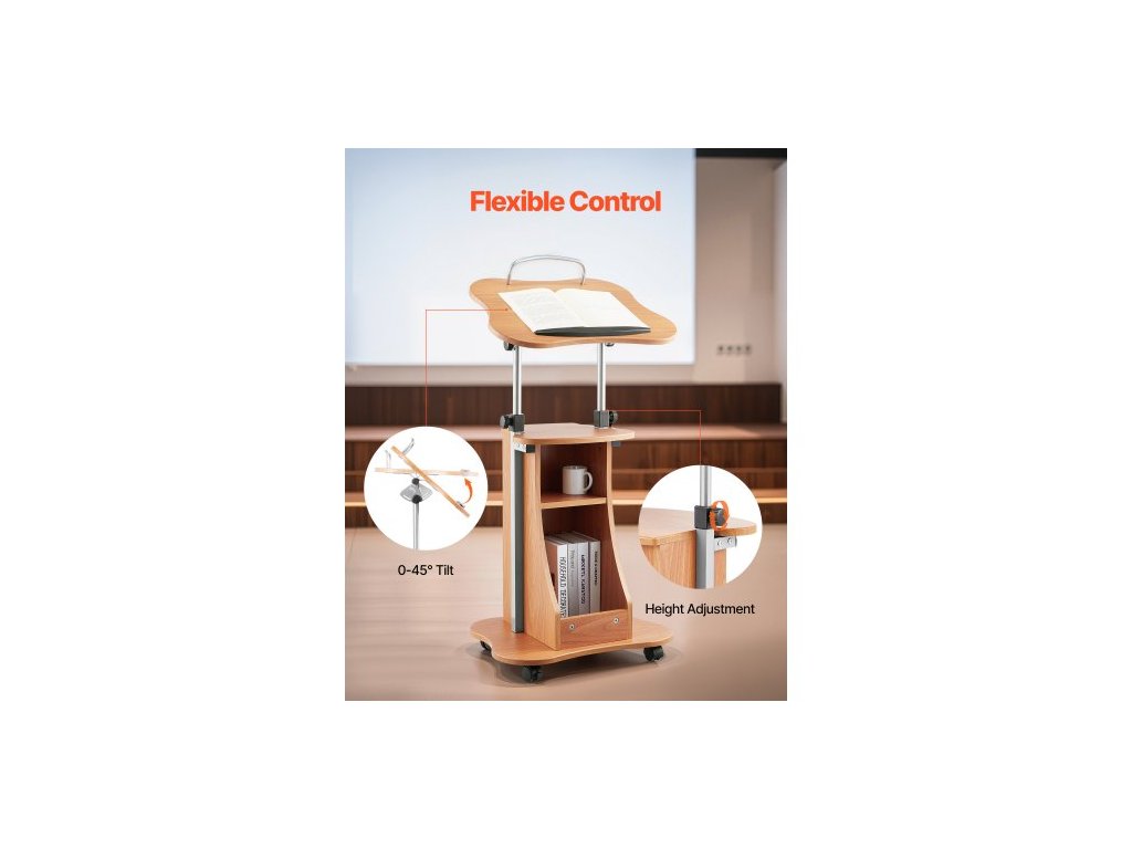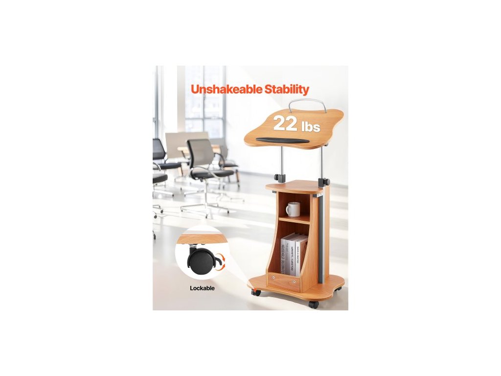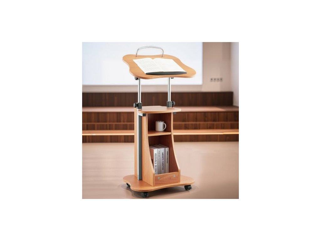 Stojan na pódium , dřevěný pultík 1100 mm, přenosný stůl na notebook s uzamykatelnými kolečky, široká čtecí plocha a otevřený úložný prostor, nastavitelná výška a úhel, pro projevy, přednášky nebo prezentaceNastavitelné pojízdné pódium s úložným prostorem