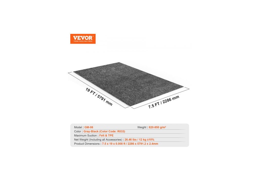 Hlavní materiály: Plsť a TPE, Čistá hmotnost (včetně veškerého příslušenství): 26,46 lbs / 12 kg ±10 %, Barva: Šedo-černá, Model: GM-06, Rozměry produktu: 7,5 x 19 x 0,008 ft / 2286 x 5791,2 x 2,4 mm, Hmotnost: 820-850 g/m²