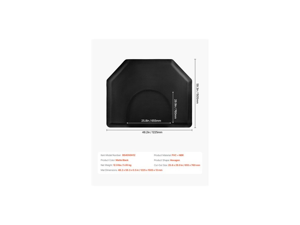 Tvar produktu: Šestihran,Barva produktu: Matná černá,Číslo modelu položky: BS4050H12,Rozměry podložky: 48,2 x 59,3 x 0,5 palce / 1225 x 1505 x 13 mm,Materiál: PVC + NBR,Rozměry výřezu: 25,8 x 29,9 palce / 655 x 760 mm,Čistá hmotnost: 12,9 lbs / 5,85 kg