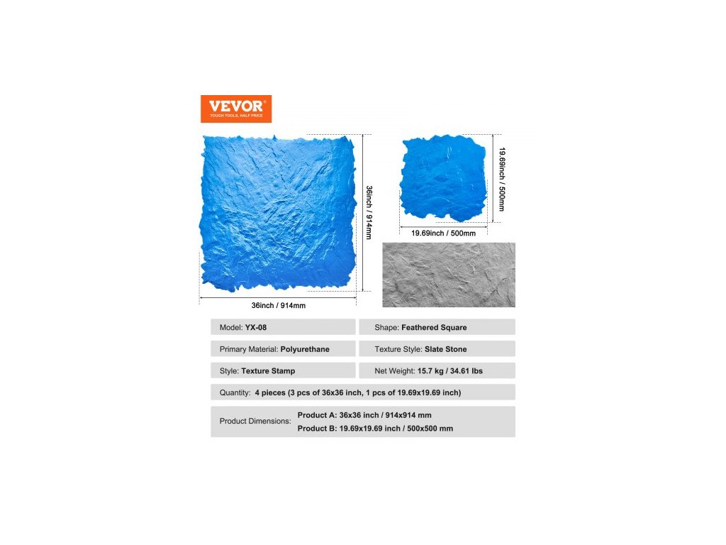 Hlavní materiál: Polyuretan, Produkt A: 35,43x35,43 palců / 900x900 mm, Produkt B: 19,69x19,69 palců / 500x500 mm,Tvar: Peříčkový čtverec,Číslo modelu položky: YX-08,Styl textury: Břidlicový kámen,Styl: Texturovací váleček,Množství: 4 kusy (3 ks 36x36 palců, 1 ks 18x18 palců),Rozměry produktu:,Čistá hmotnost: 15,7 kg / 34,61 liber