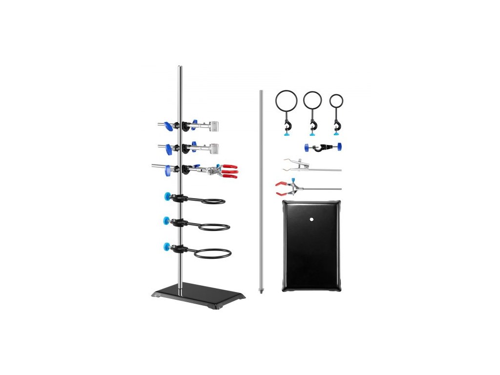 Podpěra laboratorního stojanu , sada podpěrných stojanů pro laboratorní retorty, ocelový laboratorní stojan s tyčí 59,9 cm a litinovou základnou 21,1 x 13,5 cm, včetně svěrek na baňky, svěrky na byretu a křížových svěrek