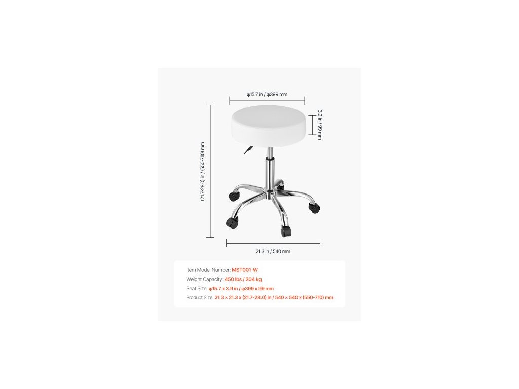 Hlavní materiály: kůže, houba, železo,Nastavitelná výška: 21,7-28,0 palců / 55-71 cm,Rozměry sedáku: φ15,7 x 3,9 palců / φ39,9 x 9,9 cm,Nosnost: 450 liber / 204 kg,Barva: Bílá,Číslo modelu položky: MST001-W,Styl: Pultová stolička,Čistá hmotnost: 10,9 liber / 4,95 kg,Rozměry výrobku: 21,3 x 21,3 x (21,7–28,0) palců / 54 x 54 x (55–71) cm