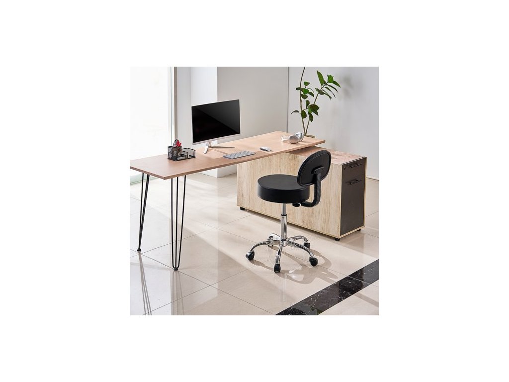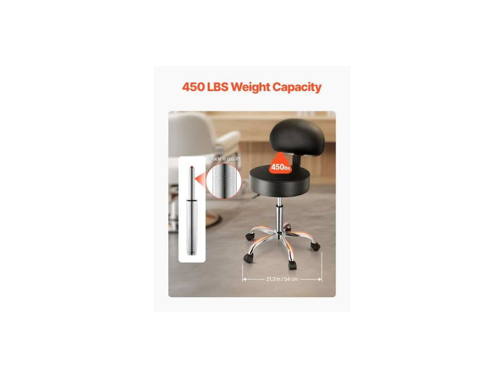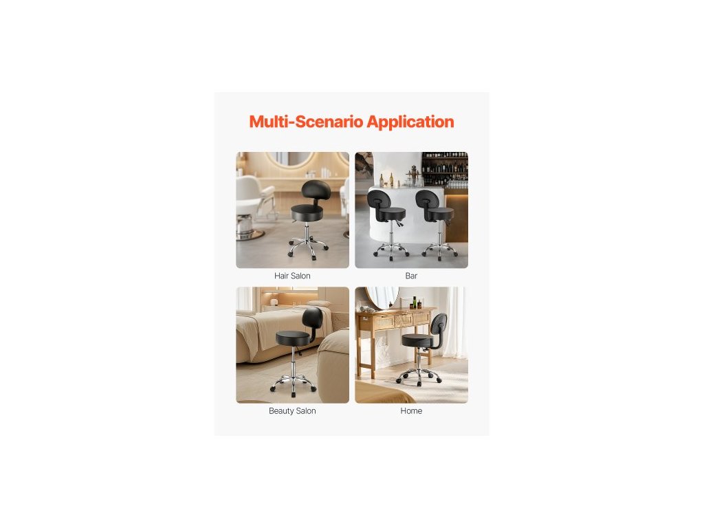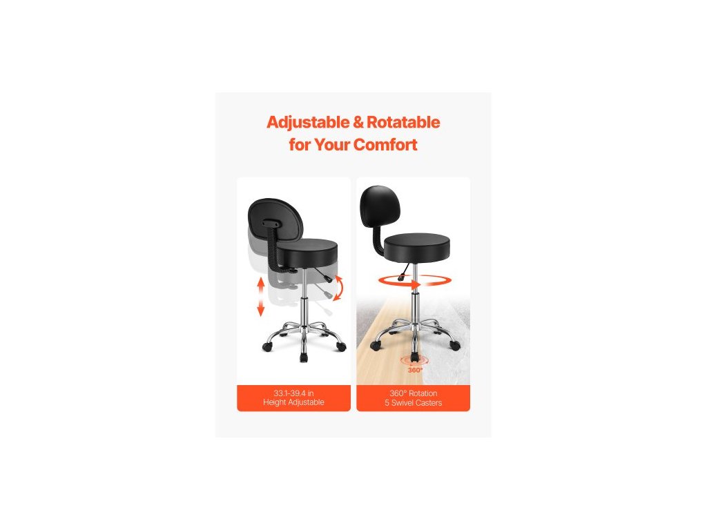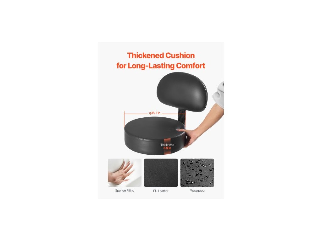 Pojízdná stolička s opěrkou zad a kolečky, nosnost 450 liber, kulatá pojízdná stolička, výškově nastavitelná, zesílená PU kůže, otočná stolička pro salon, lázně, masáže, tetování, kliniku, černá