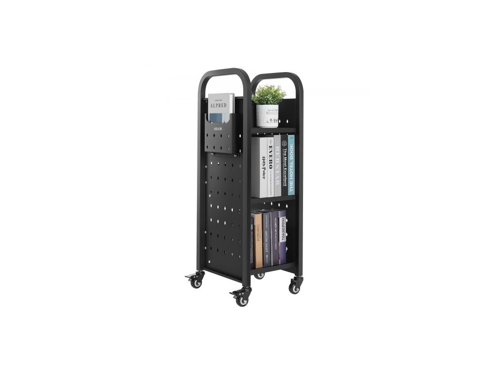 Pojízdný knihovní vozík , nosnost 100 kg, 32 x 35 x 93,5 cm, jednostranné police ve tvaru L s uzamykatelnými kolečky 50,8 mm, vozík na knihy pro domácí, kancelářské a školní účely, černýMultifunkční knihovní vozík 3 v 1