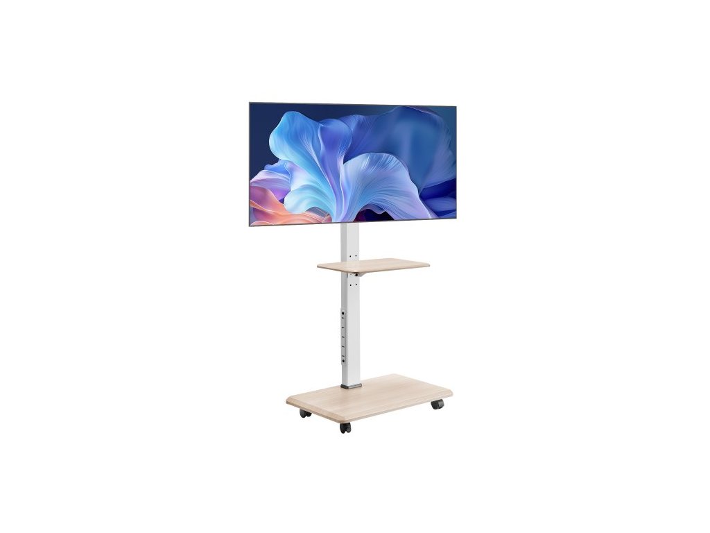 Pojízdný televizní stojan , mobilní televizní vozík pro obrazovky 32-70 palců, otáčení 25° vlevo-vpravo a výškově nastavitelný držák na TV s odkládacím stolkem, nosnost až 38 kg pro roh, ložnici, venkovní použití, max. VESA 600x400 mm