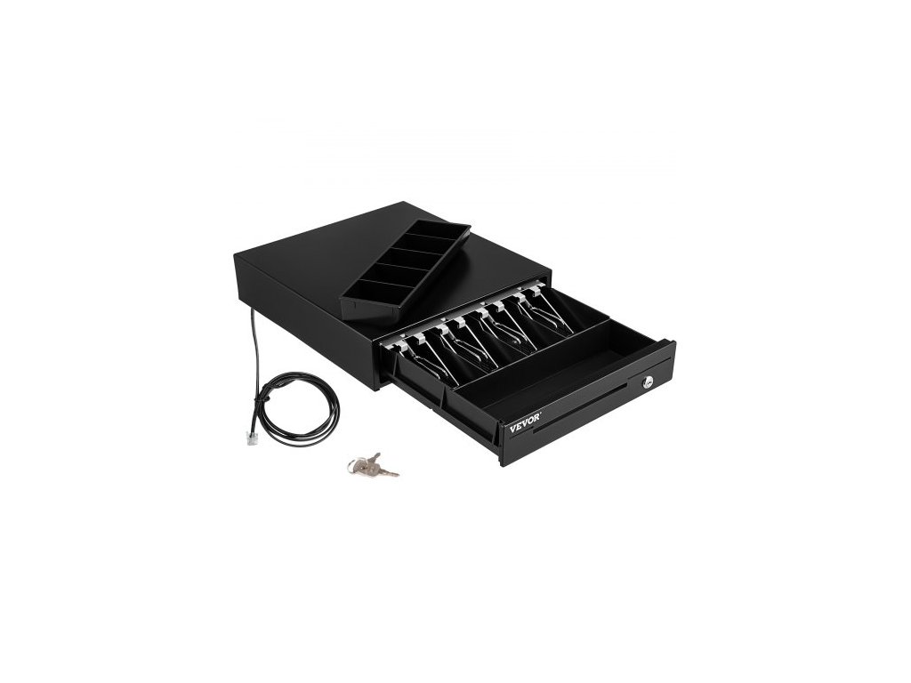 Pokladní zásuvka , 33 cm, 12 V, pro POS systém s přihrádkou na 4 bankovky a 5 mincí, vyjímatelnou přihrádkou na mince a 2 klíči součástí balení, kabel RJ11/RJ12 pro supermarket, bar, kavárnu, restauraci
