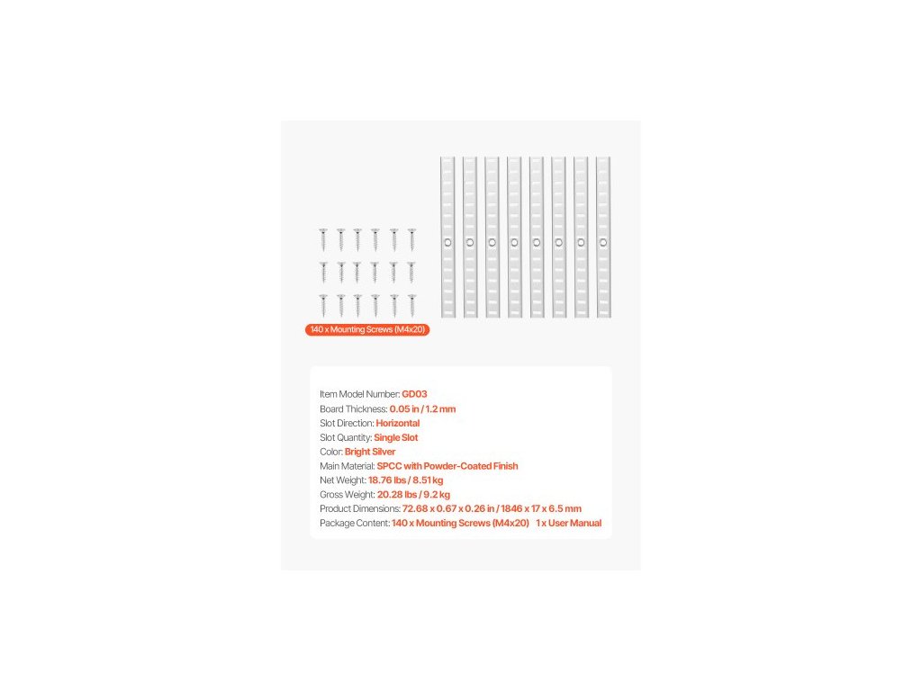 Počet slotů: Jeden slot,Hrubá hmotnost: 9,2 kg,Barva: Světle stříbrná,Číslo modelu položky: GD03,Směr slotů: Vodorovný,Rozměry výrobku: 1846 x 17 x 6,5 mm,Čistá hmotnost: 8,51 kg,Tloušťka desky: 1,2 mm,Hlavní materiál: SPCC s práškovým lakováním