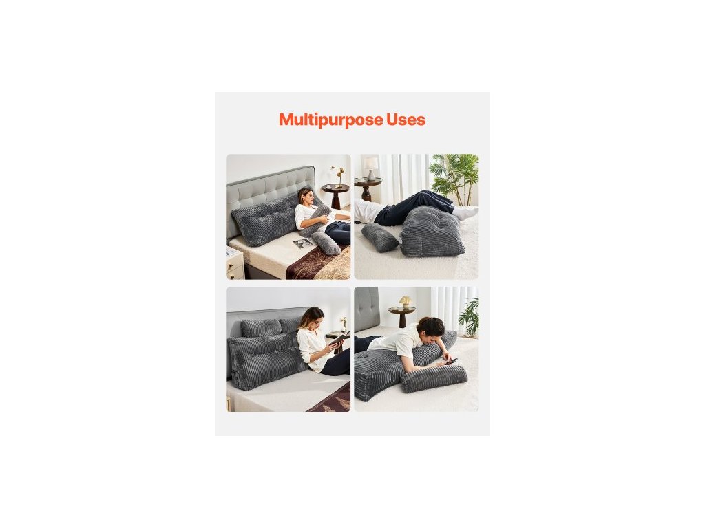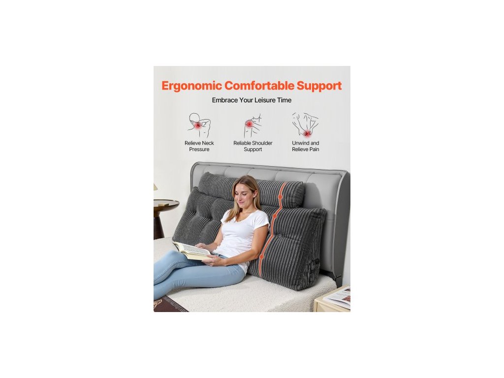 Polštář na čelo postele, klínový polštář na čelo postele velikosti Queen se 2 bočními kapsami a 2 opěrkami hlavy, klínový polštář na postel s pratelným flanelovým potahem, pro čtení, hraní her, odpočinek, práci v posteli, šedýUltra měkká sametová tkanina šetrná k pokožce