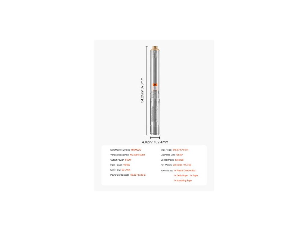 Max. dopravní výška: 278,87 stop / 85 m, max. Průtok: 65 l/min, Režim ovládání: Externí, Výstupní výkon: 550 W, Vstupní výkon: 1100 W, Napěťová frekvence: AC 230 V 50 Hz, Číslo modelu položky: 4SDM2/12, Velikost výboje: G1,25", Rozměry výrobku: 34,25 x 4,02 x 4,02 palce / 870 x 102,4 x 102,4 mm, Čistá hmotnost: 32,43 lbs / 14,7 kg