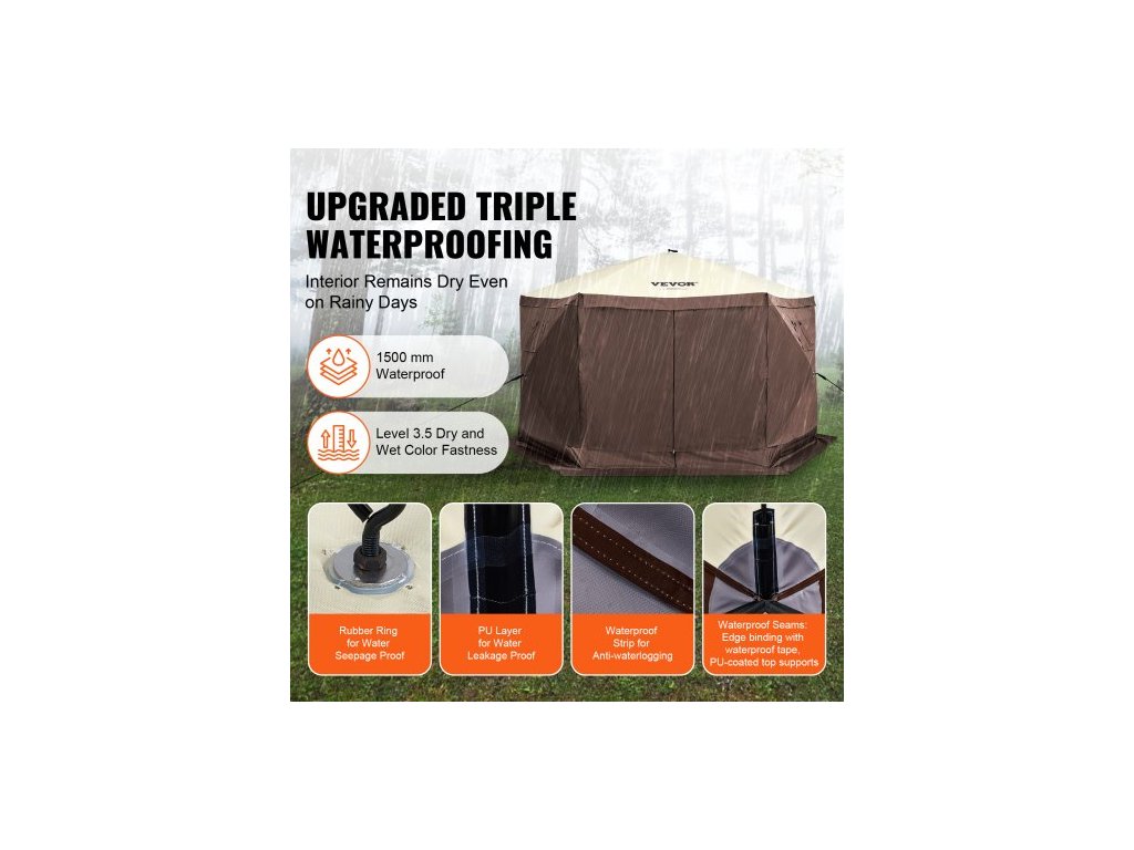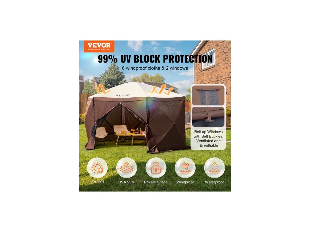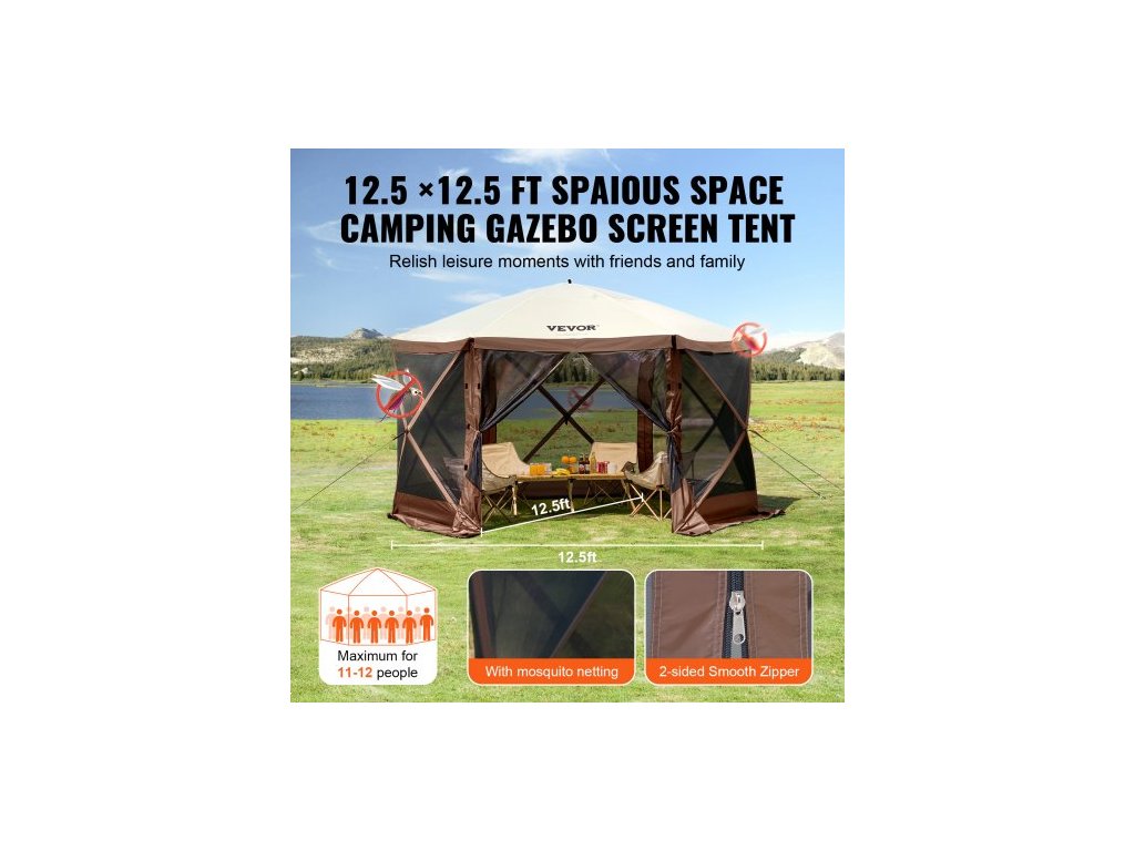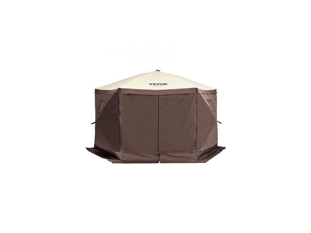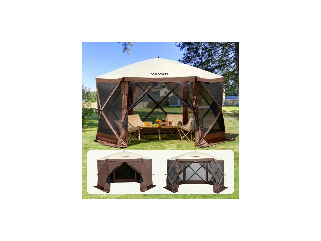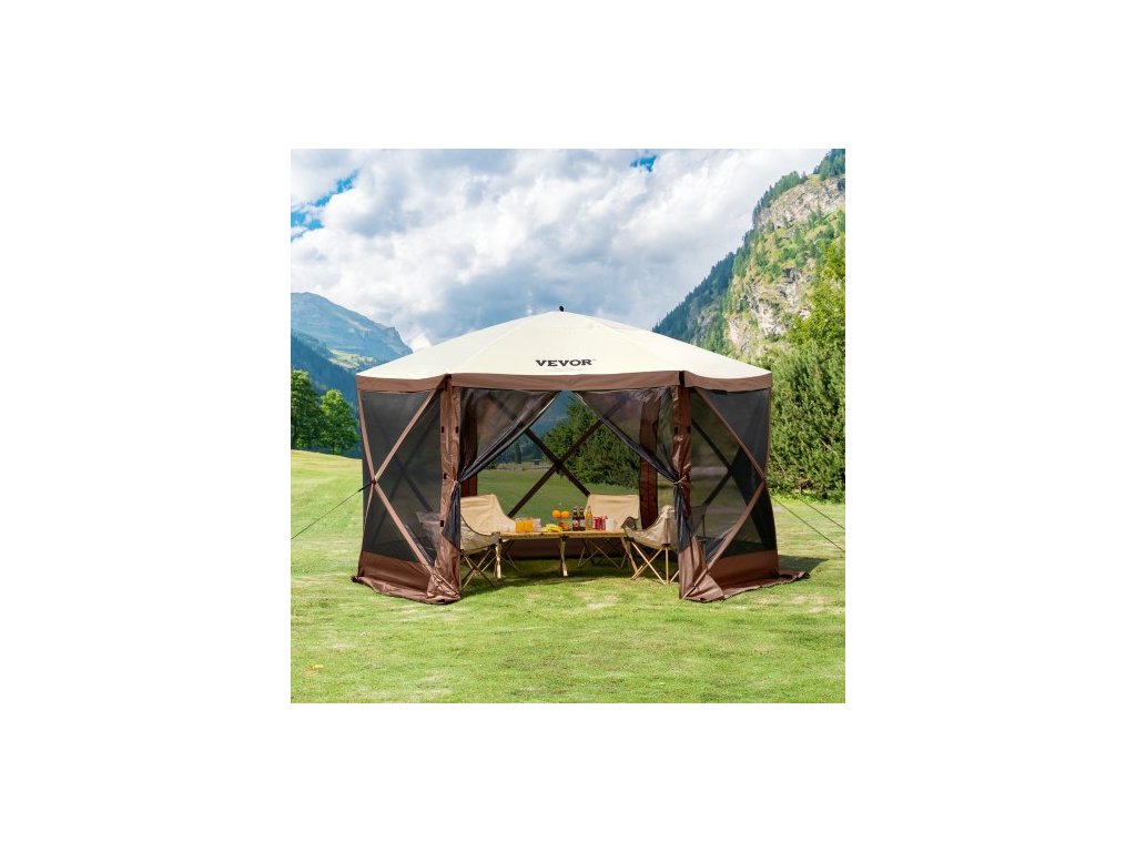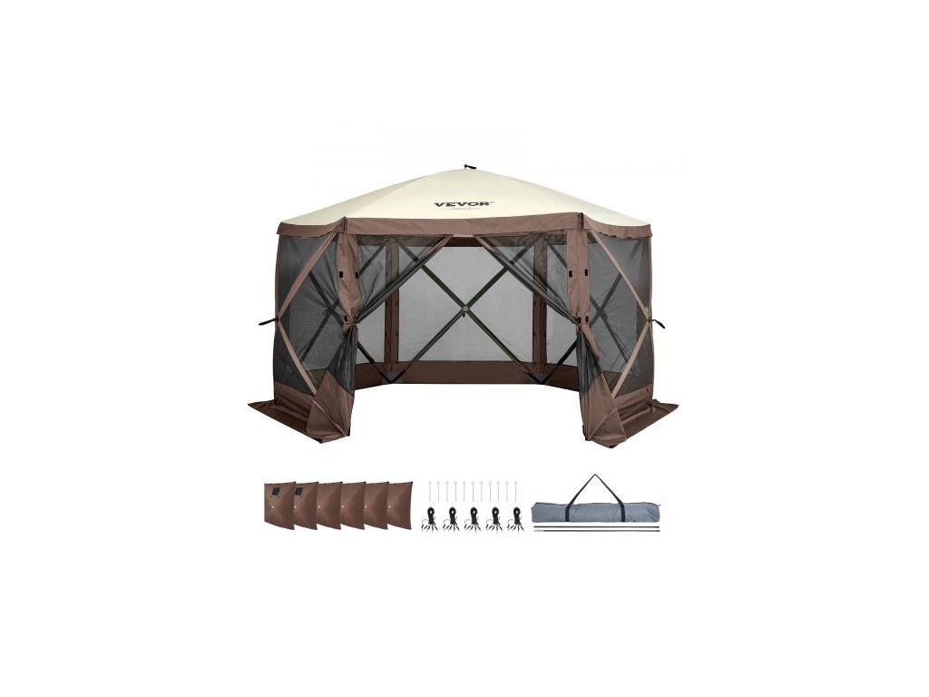 Rozkládací altán, rozkládací stan se 6strannou stříškou proti slunci s 6 odnímatelnými větrnými clonami a síťovanými okny, 12,5x12,5FT rychle nastavitelný stan se sítí proti komárům, hnědýProstorný kempingový altán se sítí