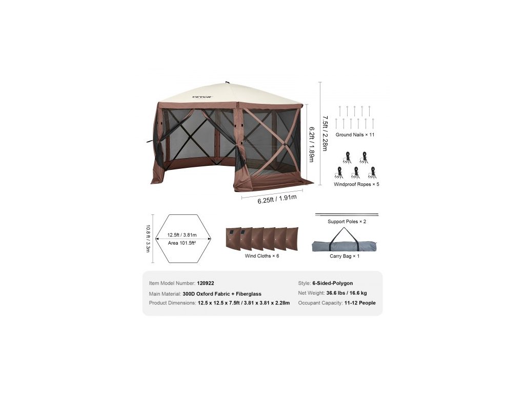 Větruodolné clony: 6, Délka větruodolného lana: 3 m, Číslo modelu položky: 120922, Styl: 6stranný polygon, Průměr podpůrné tyče: φ11 mm, Kapacita: 8 osob, Okna: 2, Rozměry produktu: 12,5 x 12,5 x 7,5 stop/3,81 x 3,81 x 2,28 m, Čistá hmotnost: 37,9 lbs / 17,2 kg, Hlavní materiál: Oxfordská tkanina 300D + sklolaminát